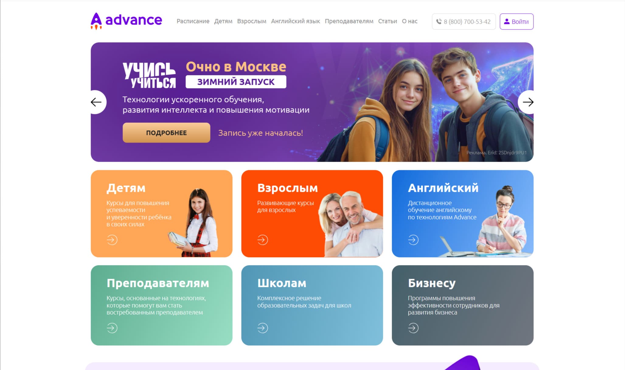 Advance- партнерская программа в сфере образовательных услуг. Средний чек покупок — от 25 000 до 75 000 рублей, средний заработок партнёров — 80 000 рублей. Программа предоставляет прозрачную статистику, оперативную обратную связь, ежемесячные выплаты и помощь в виде повышения ставок, рекламных материалов, акций и промокодов.