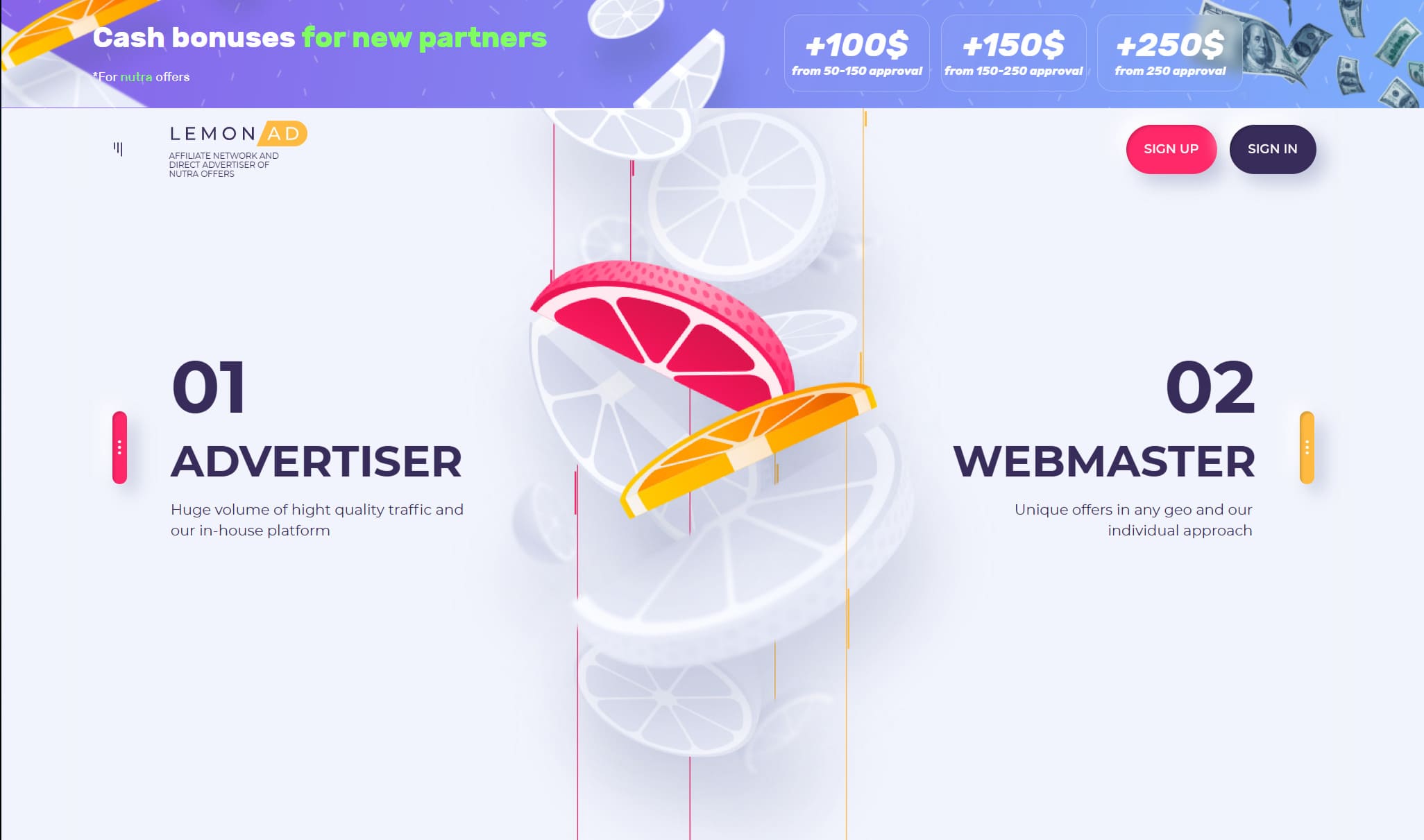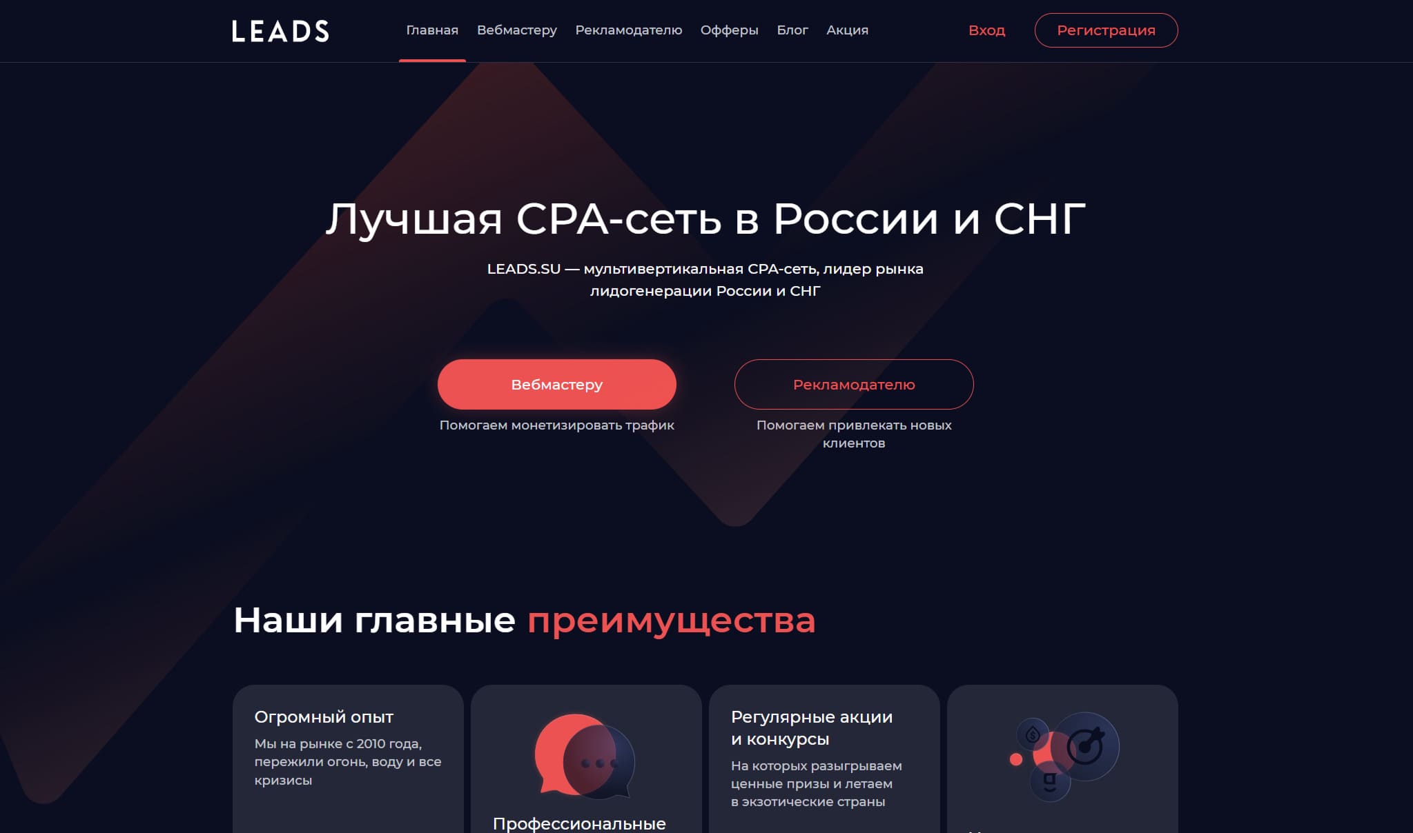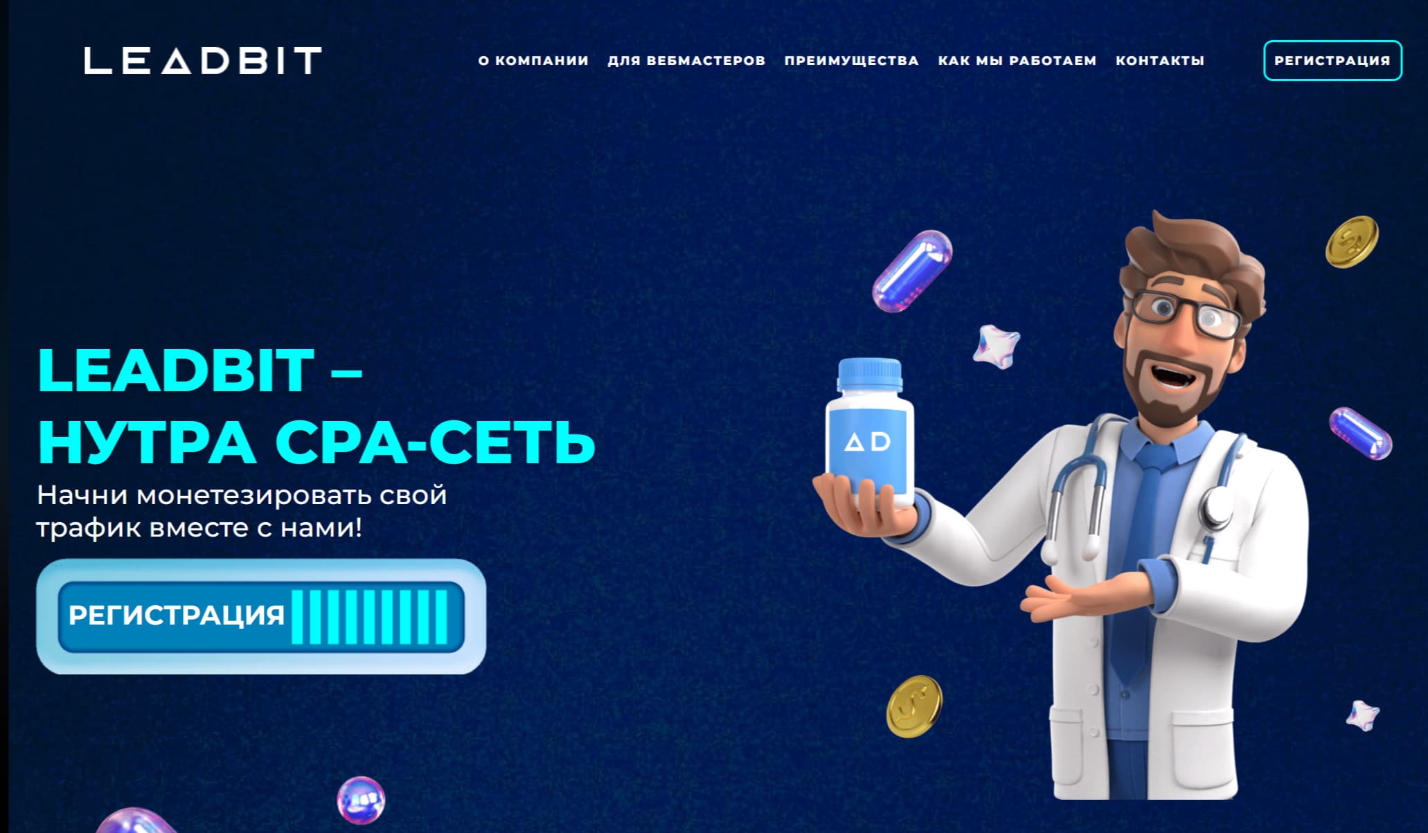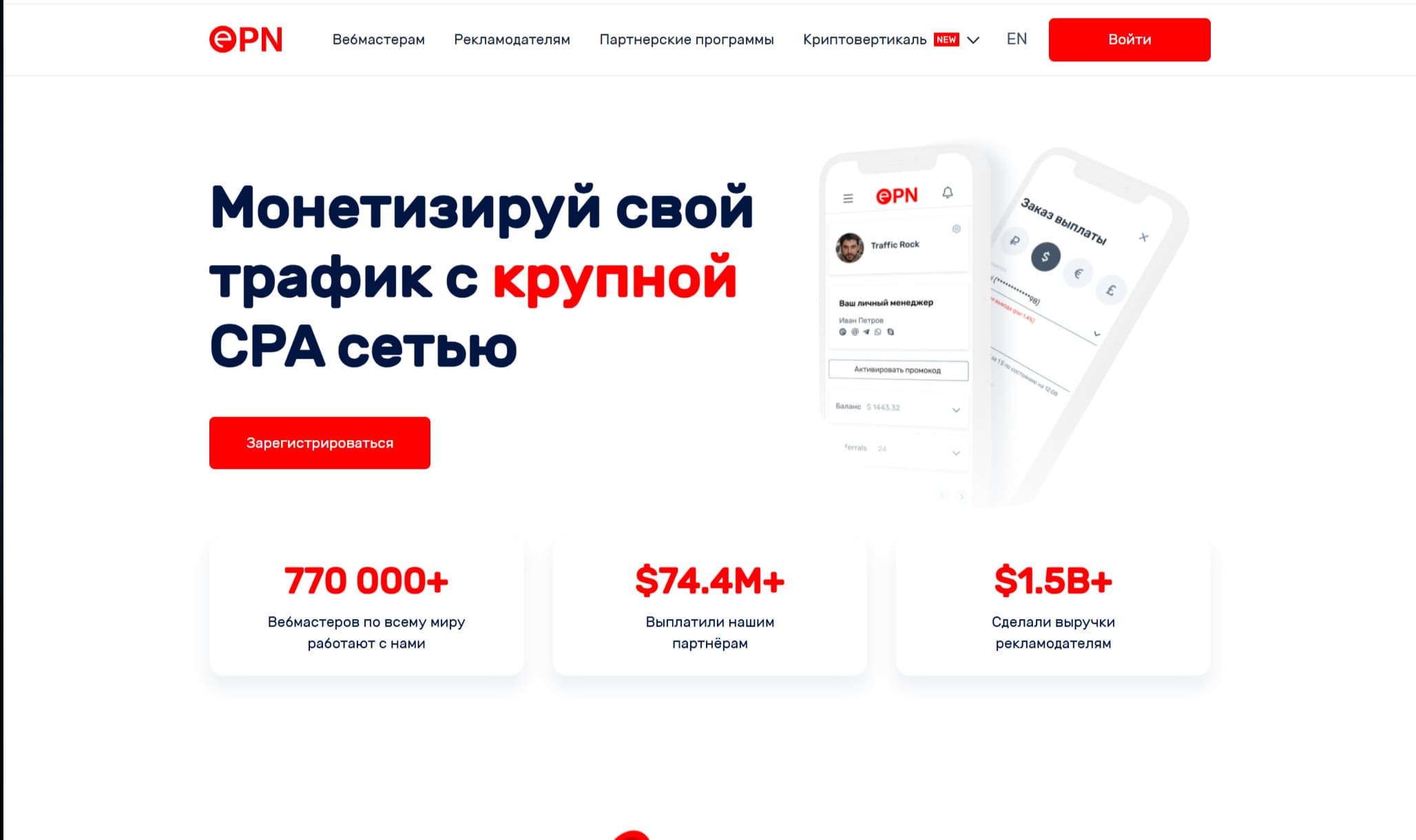 Платформа для вебмастеров и рекламодателей, где они могут сотрудничать в рамках CPA-сети. Подчёркивают длительный опыт работы — 14 лет, а также внушительные статистические показатели, такие как количество заработанных средств вебмастерами, подключённых офферов и конверсий. Платформа предлагает различные инструменты экосистемы, бонусы и награды за трафик, а также возможность управления рекламными бюджетами в едином личном кабинете. Акцент делается на персональных условиях для вебмастеров, быстрой помощи от менеджера и комфорте работы с сетью.