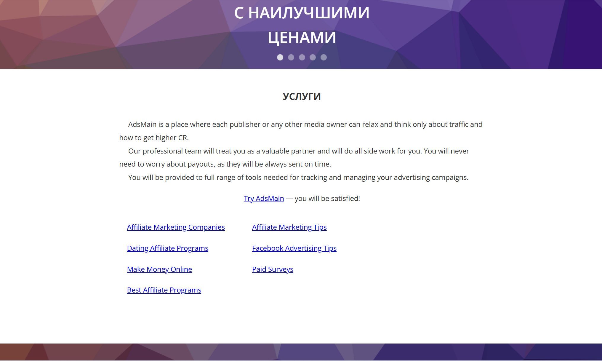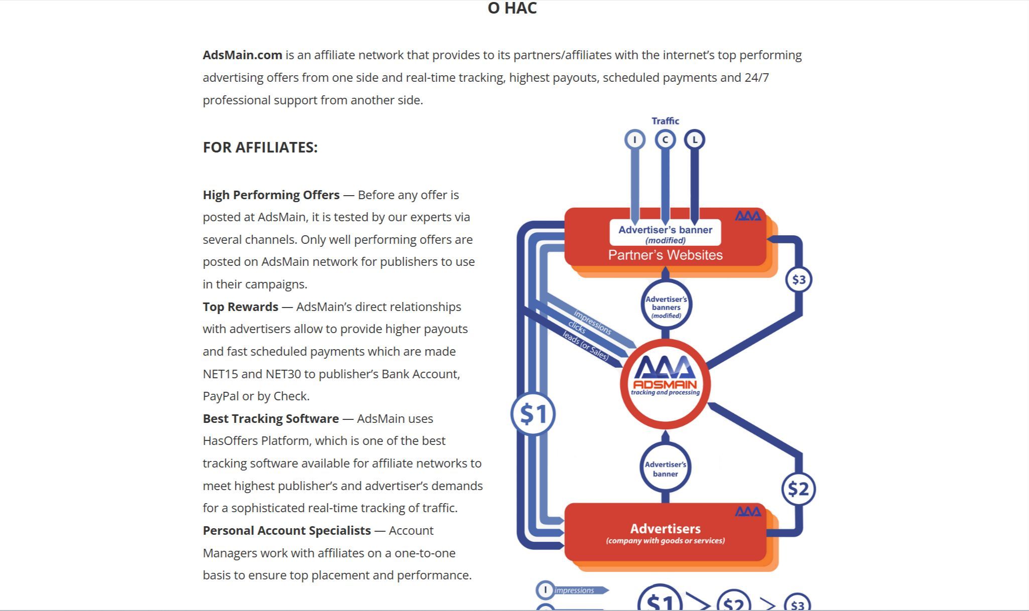 CPA- сеть, сотрудничают с рекламодателями и вебмастерами по всему миру, включая СНГ, и охватывают все популярные тематики — авто, красота, здоровье, финансы, гэмблинг, adult. Компания находится в США, существует с 2010 года. Создание максимально комфортных условий для работы партнеров, как арбитражников, так и рекламодателей, точный трекинг и максимальная прибыль всех участников.