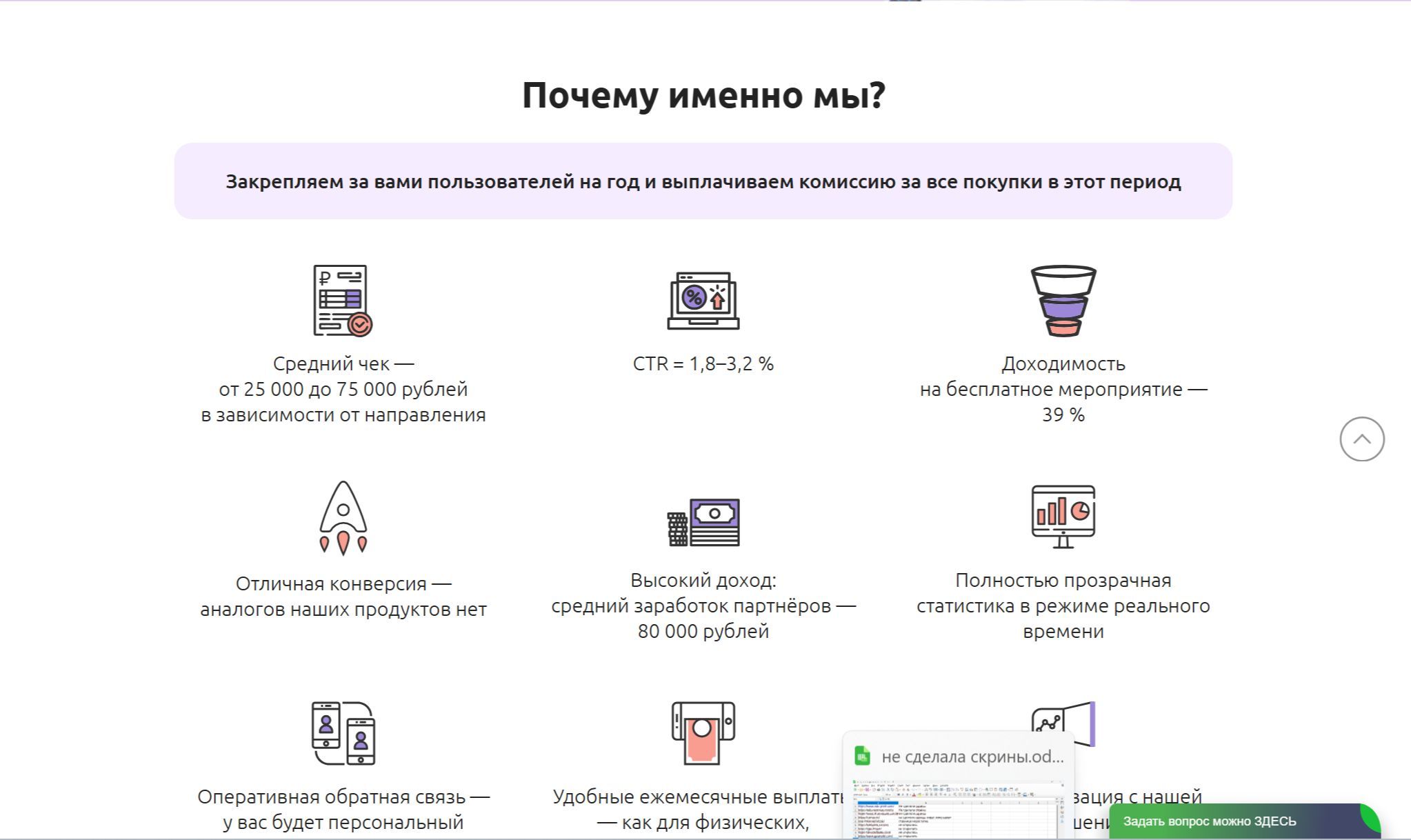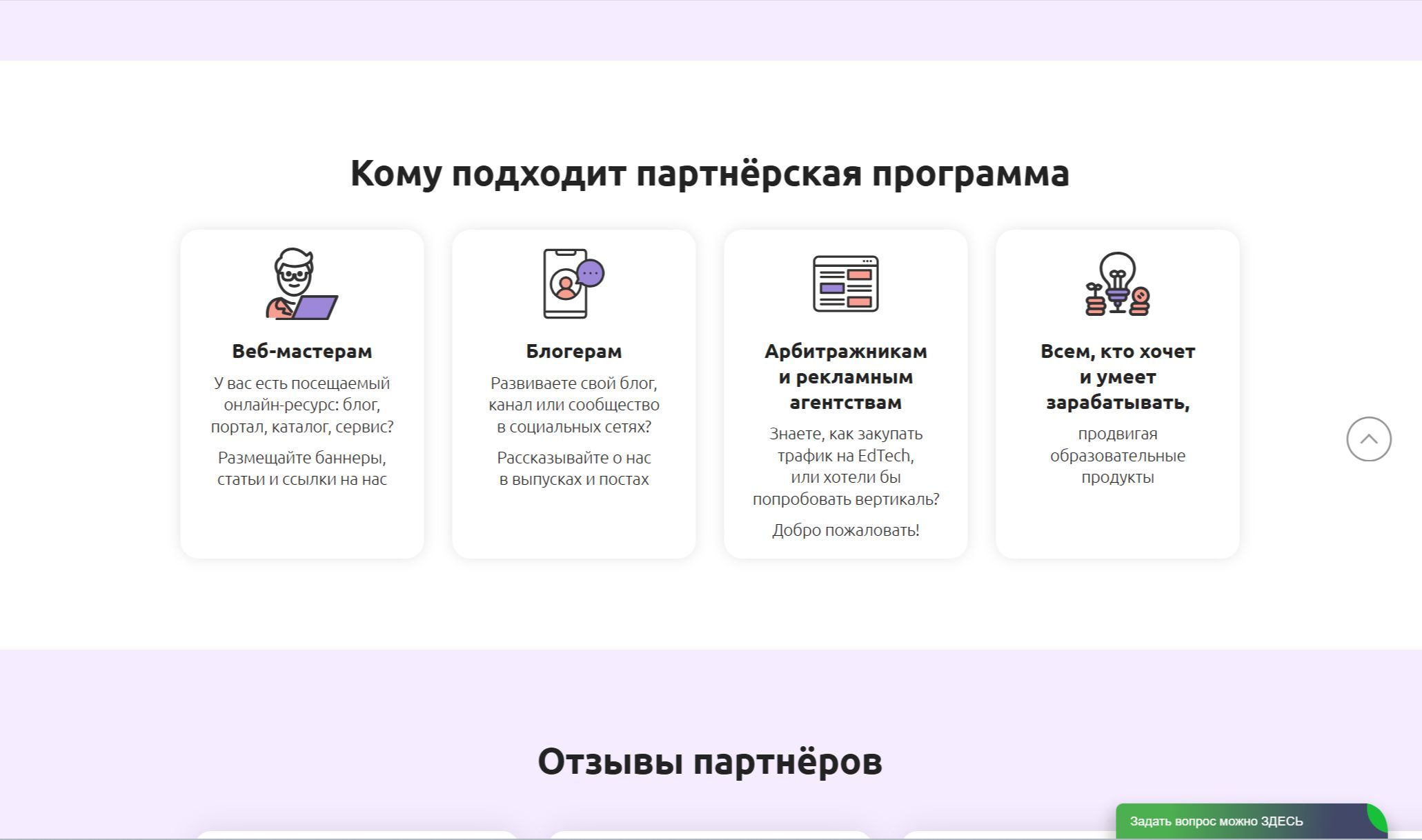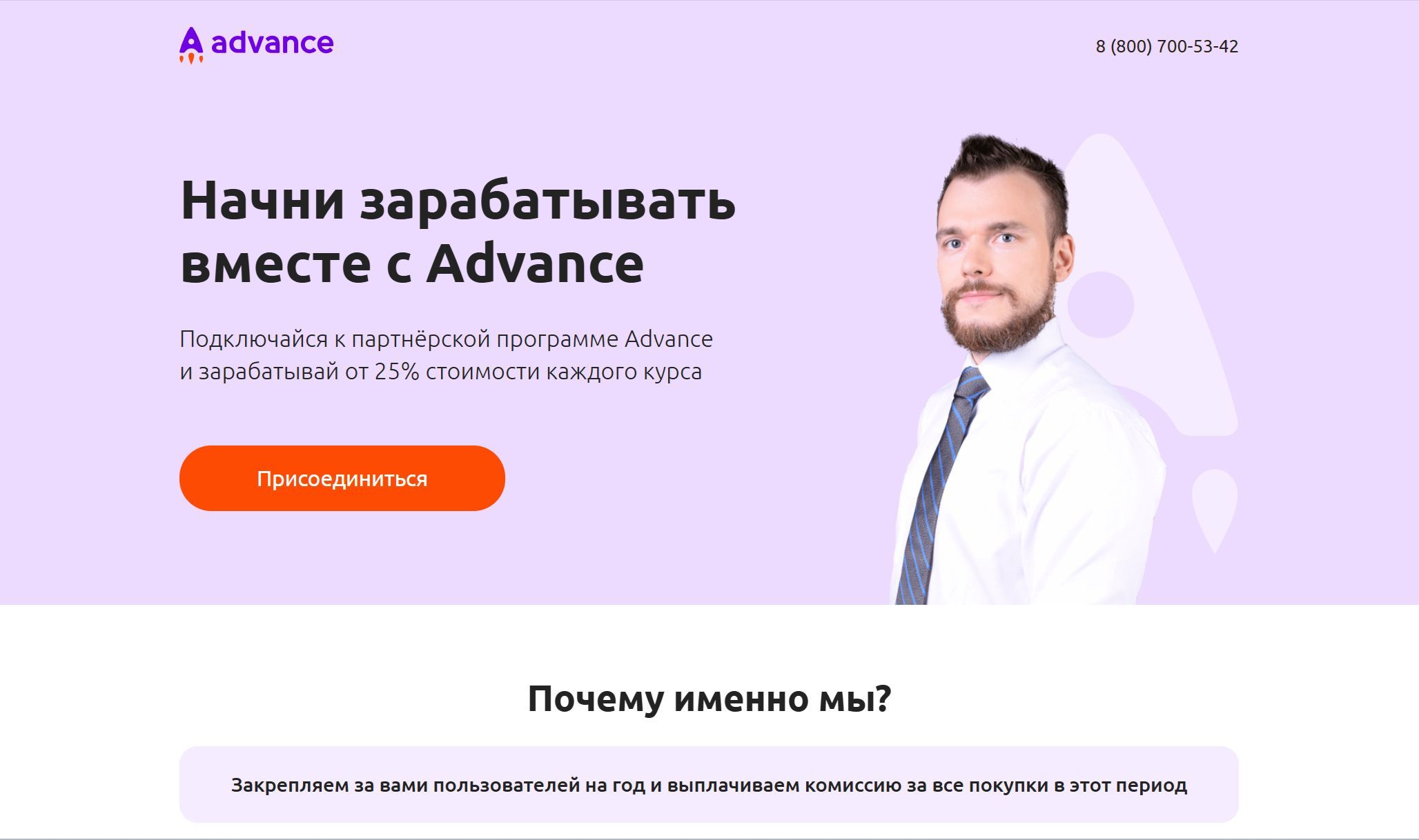 Advance- партнерская программа в сфере образовательных услуг. Средний чек покупок — от 25 000 до 75 000 рублей, средний заработок партнёров — 80 000 рублей. Программа предоставляет прозрачную статистику, оперативную обратную связь, ежемесячные выплаты и помощь в виде повышения ставок, рекламных материалов, акций и промокодов.