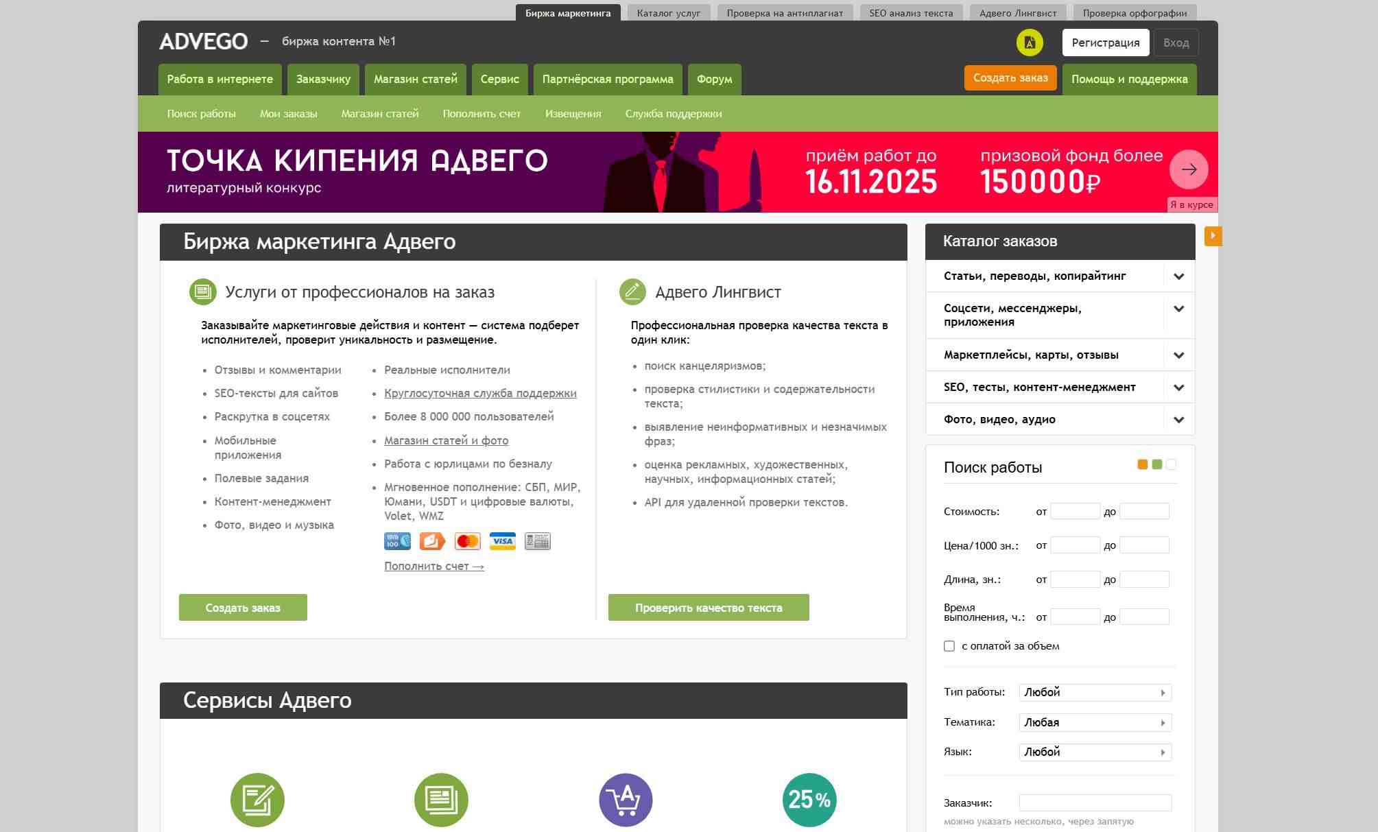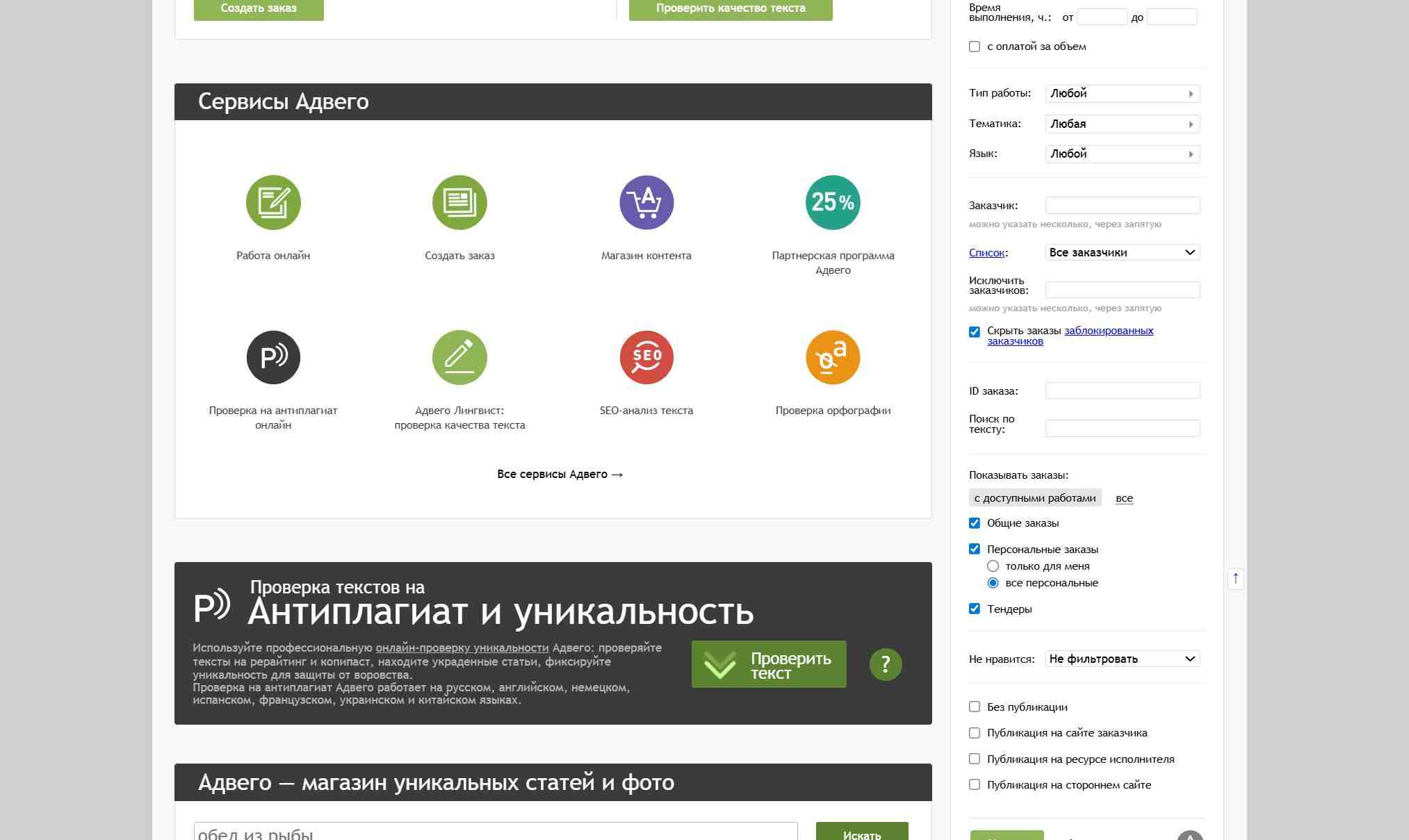 Сервис предоставляет возможность заказчикам найти проверенных авторов для создания уникального контента. На платформе можно заказать статьи для сайтов, рерайтинг и копирайтинг. Авторы проходят строгий отбор, а заказчики могут быть уверены в качестве получаемого контента. Также биржа работает не только с текстом, но с видео, графикой.