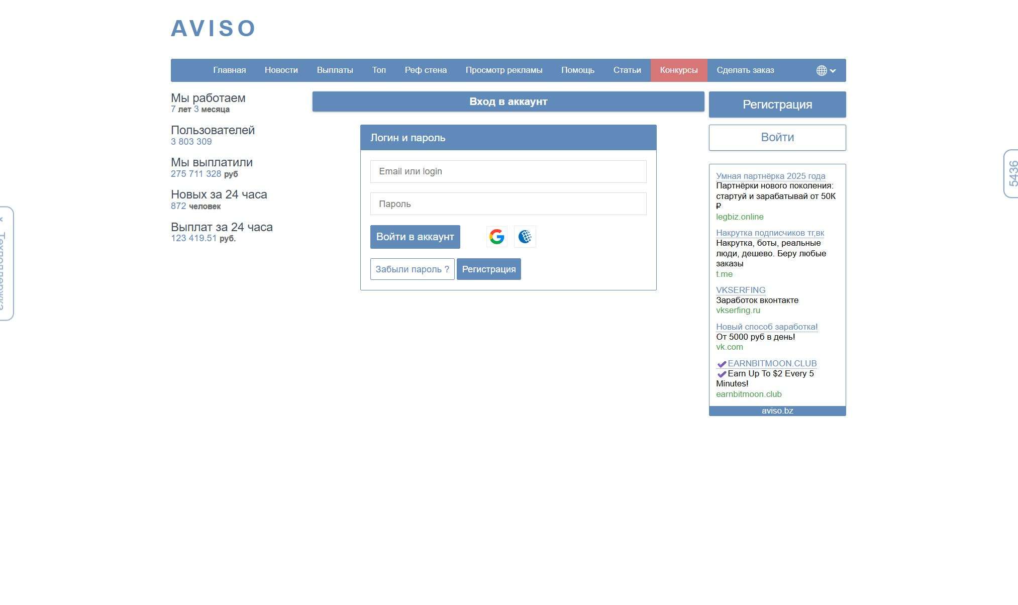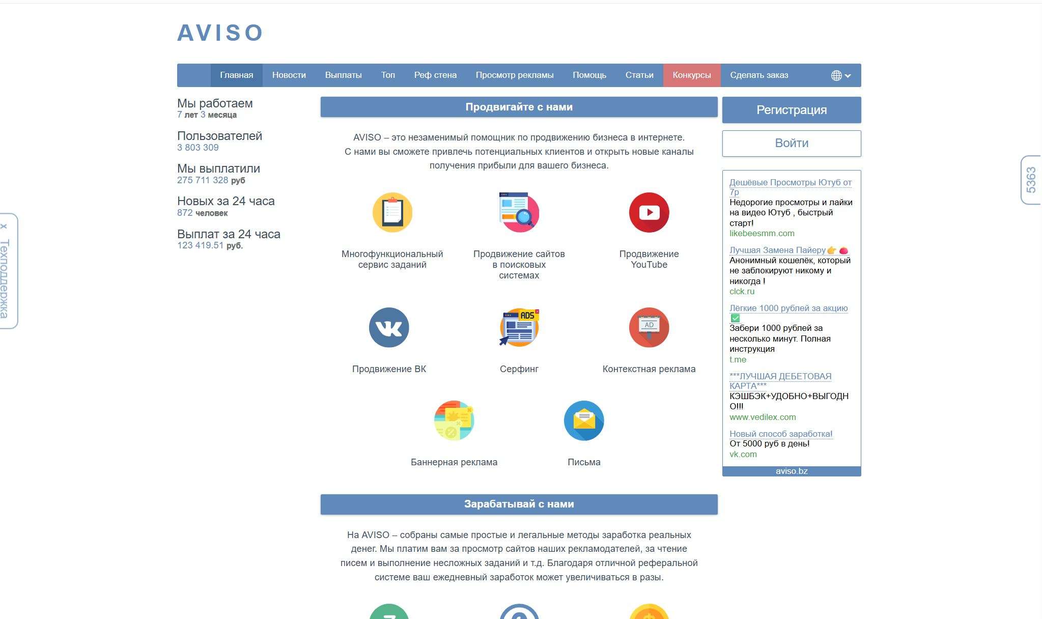 Многофункциональный сервис заданий для продвижения бизнеса в интернете. Пользователи могут зарабатывать, выполняя простые задания, такие как просмотр сайтов, чтение писем и другие. Реферальная система и конкурсы позволяют увеличивать доход. Платформа предлагает различные методы продвижения, включая серфинг, контекстную и баннерную рекламу, а также письма.