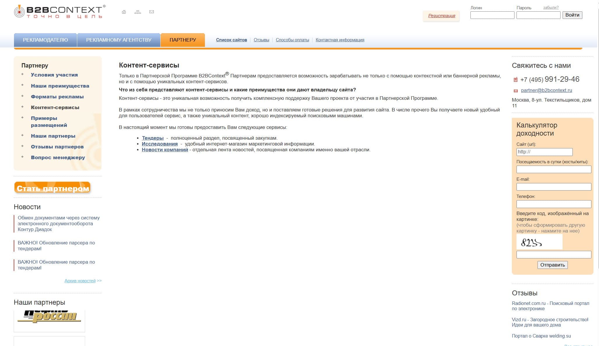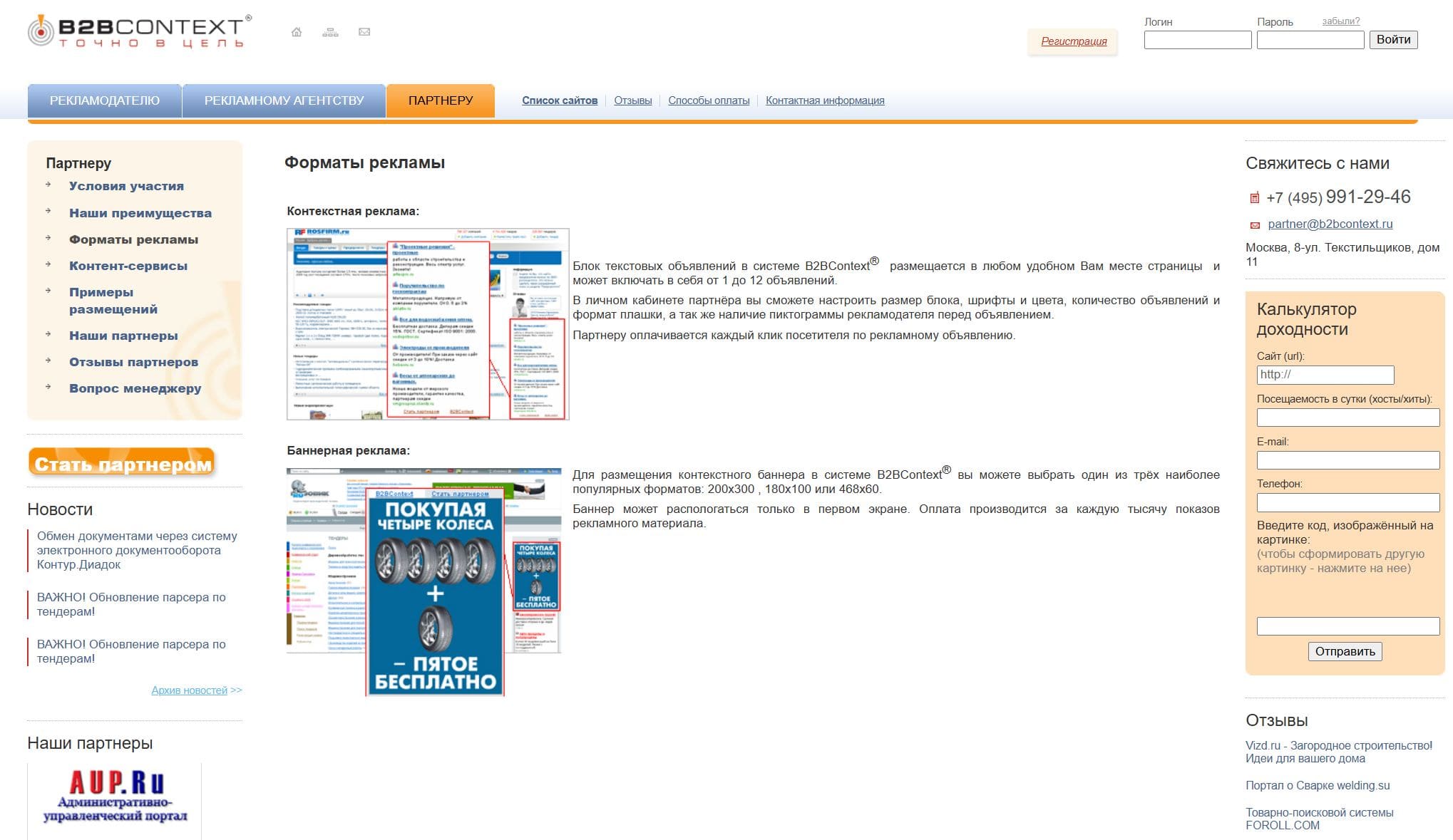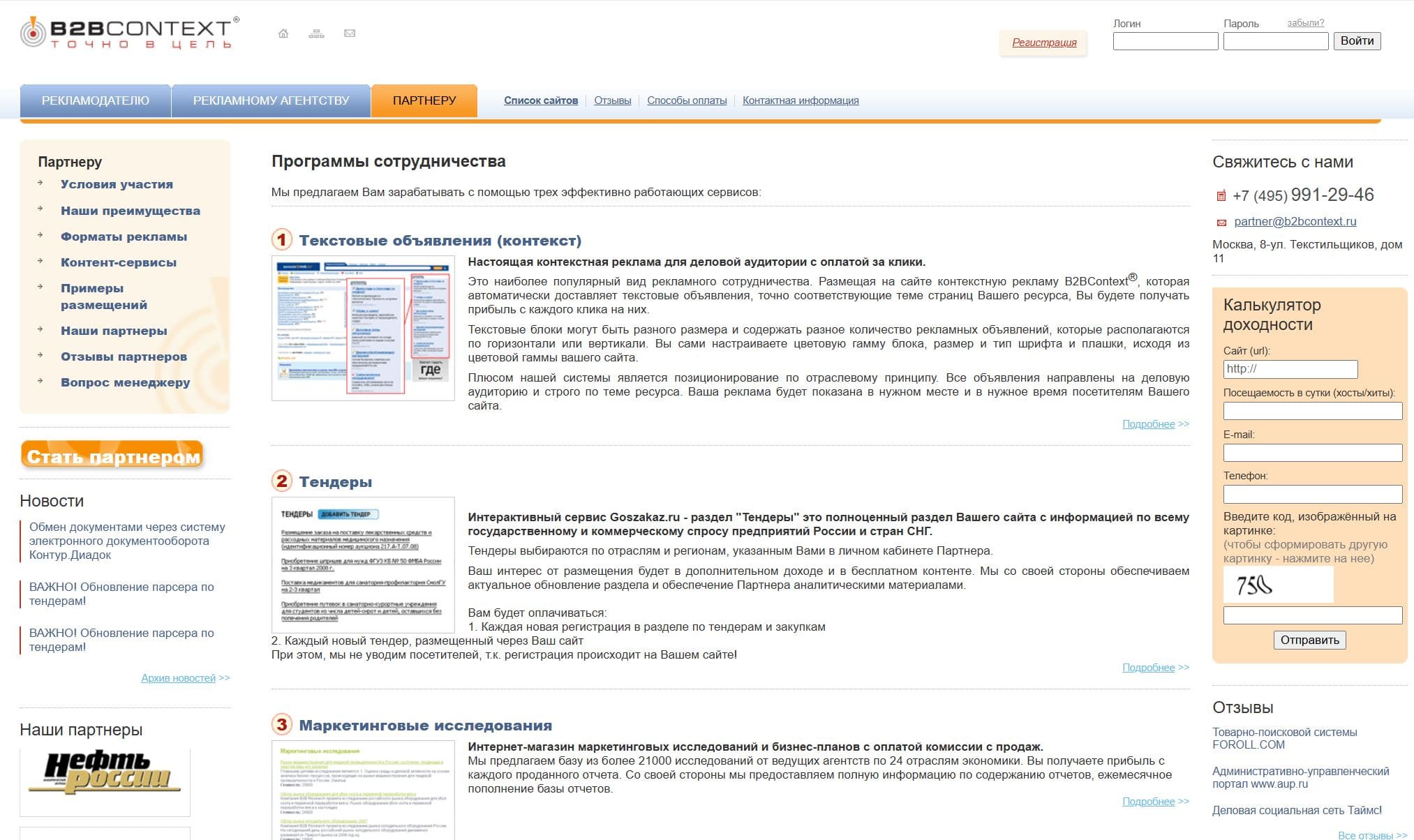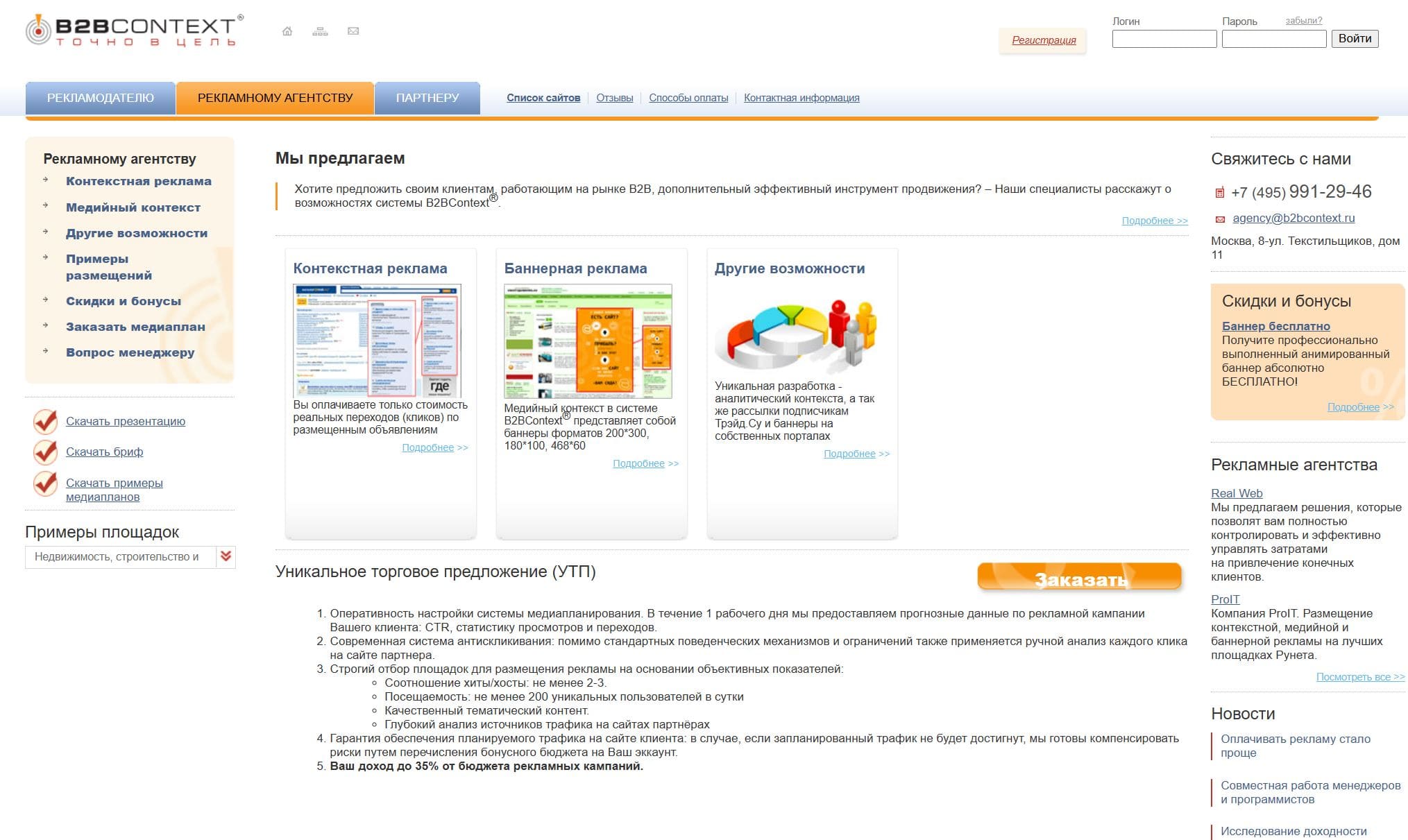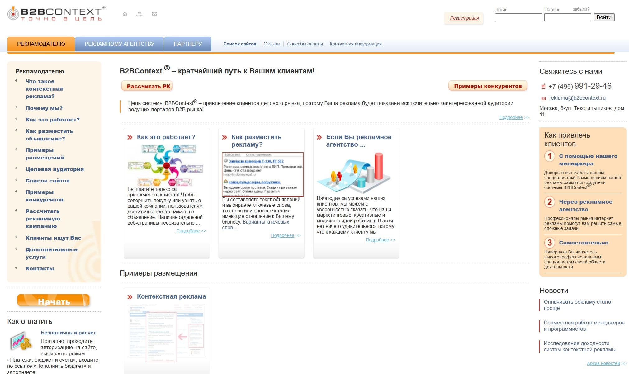 B2BContext- система контекстной рекламы для B2B рынка. Описаны принципы работы: оплата за привлечённого клиента и показ объявления заинтересованной аудитории. Представлены разделы с информацией о целевой аудитории, примерах размещений и расчёте рекламной кампании. Также есть возможность сотрудничества с рекламным агентством или самостоятельного размещения рекламы.