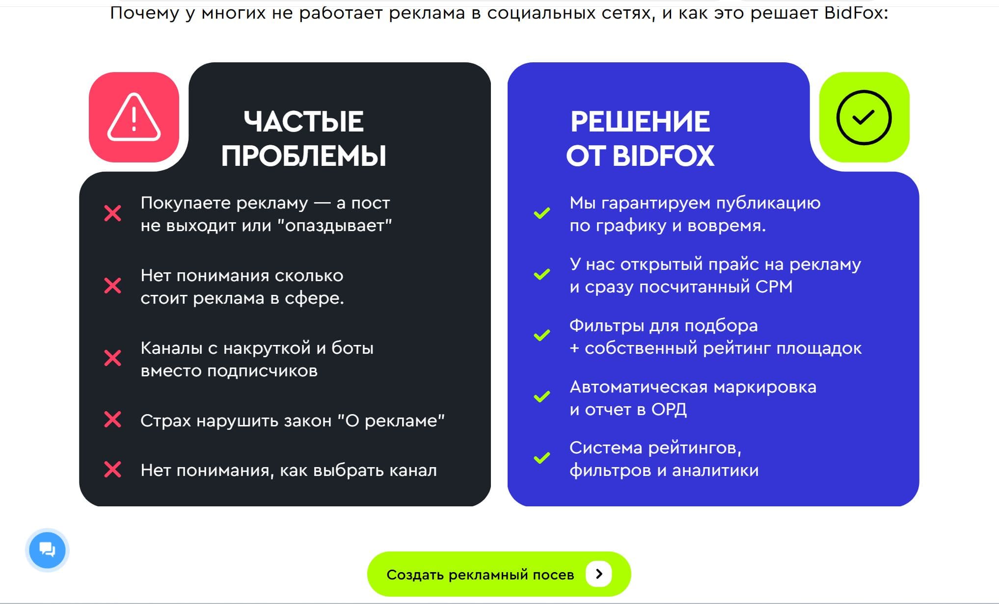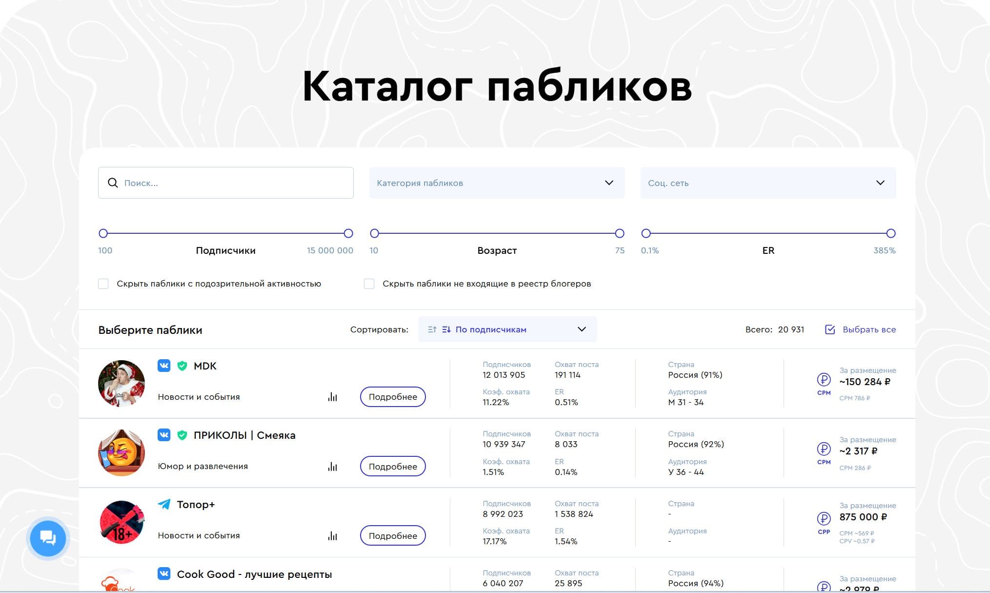 Платформа позволяет агентствам и брендам массово размещать контент в социальных сетях. С её помощью можно эффективно продвигать товары и услуги, привлекать подписчиков, распространять видео и инфоповоды. В каталоге — большое количество пабликов с данными о подписчиках, охвате, ER и других показателях. Сервис автоматизирует многие процессы: от размещения постов до сбора статистики и отправки данных в ОРД. Есть возможность воспользоваться услугой full-service, при которой персональный менеджер возьмёт на себя техническую реализацию кампании.