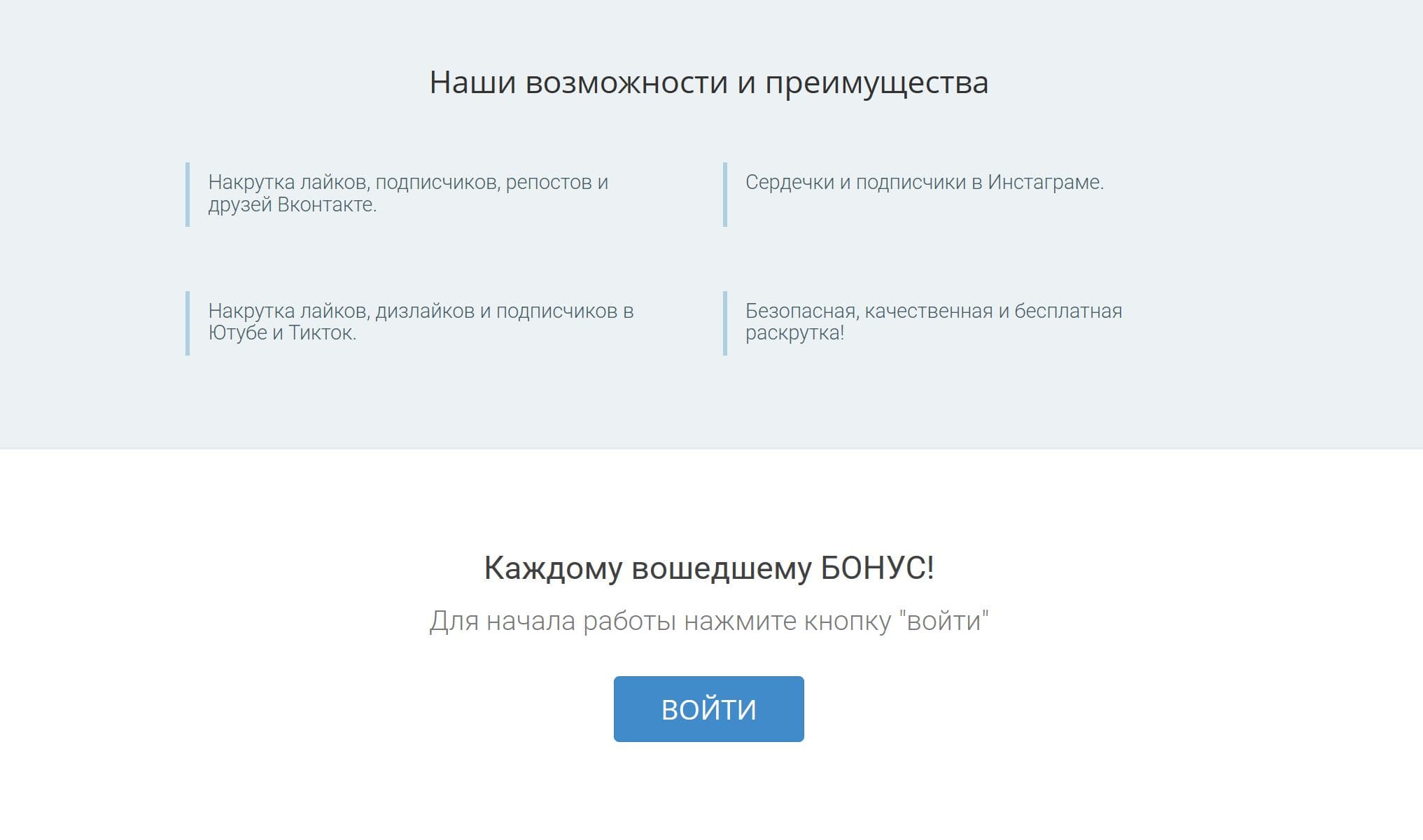 Платформа для раскрутки в соцсетях использует модель взаимного обмена: пользователи выполняют задания и получают баллы, которые можно использовать для собственных целей или купить. Доступны функции накрутки лайков, подписчиков и других показателей в ВКонтакте, Instagram, YouTube и TikTok. При этом существуют риски: аккаунты и невыполненные задания удаляются через две недели неактивности, а результаты накрутки могут оказаться временными.