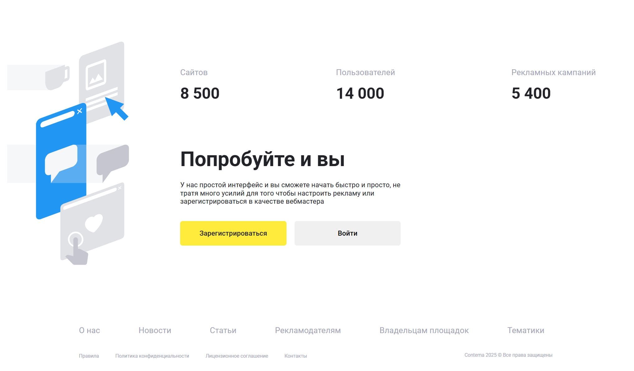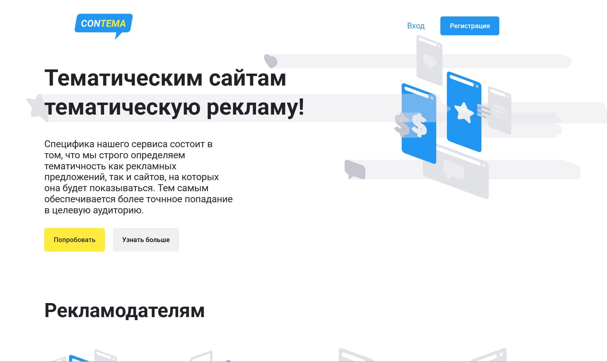 Contema- сервис, который предлагает тематическую рекламу для сайтов. Он обеспечивает точное попадание в целевую аудиторию благодаря строгому определению тематичности рекламных предложений и сайтов, на которых они показываются. Также есть конструктор баннеров, позволяющий выбрать тематику, стилистику и написать текст. Для вебмастеров предусмотрен простой процесс добавления сайта и настройки отображения рекламы под его стиль.