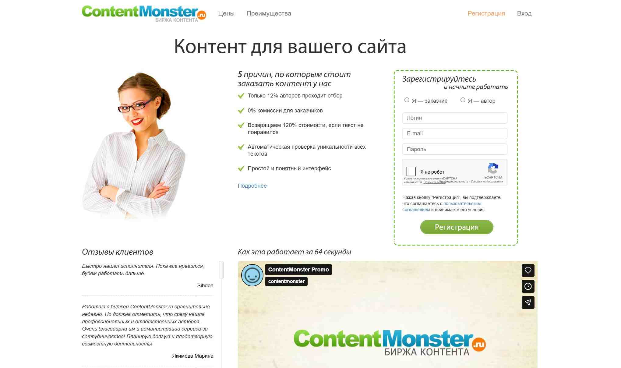 ContentMonster- биржа копирайтинга, рерайтинга. Биржа контента, где заказчики могут разместить заказы на создание уникального контента, а авторы — заработать, выполняя эти заказы.