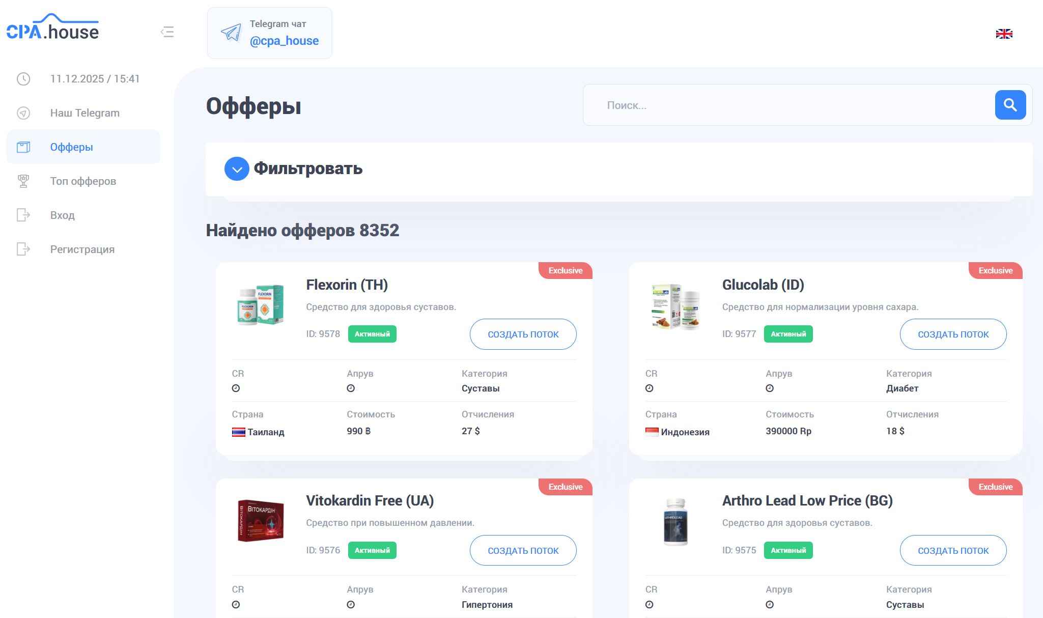 В CPA-сети предлагается широкий выбор офферов в различных вертикалях, включая дейтинг, нутра, свипстейки и другие. Высокие ставки, быстрые выплаты и подробная статистика делают работу с сетью привлекательной для вебмастеров. Защита от накруток и аналитика аудитории обеспечивают качество трафика и эффективность кампаний.