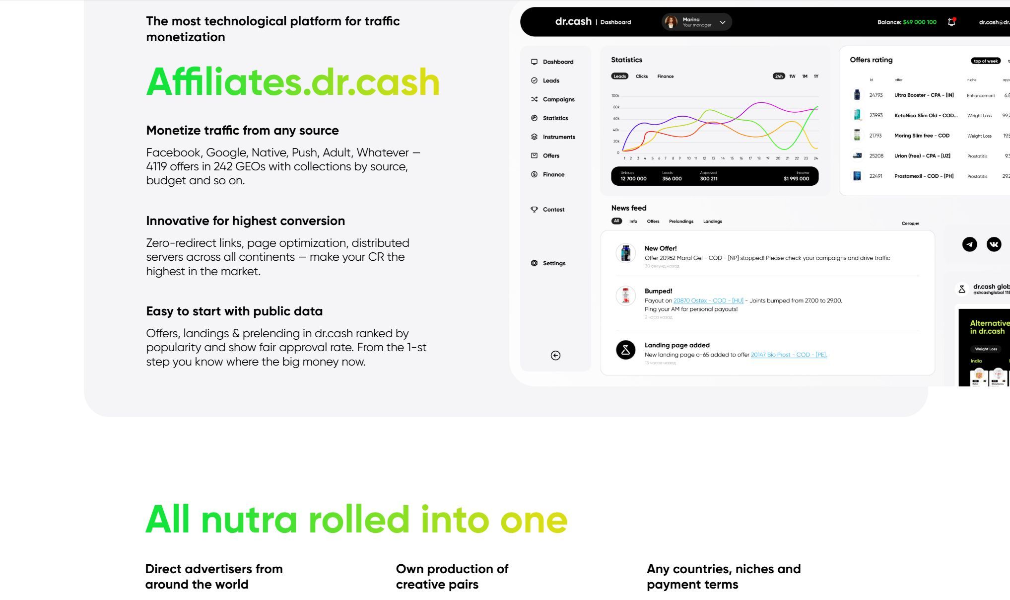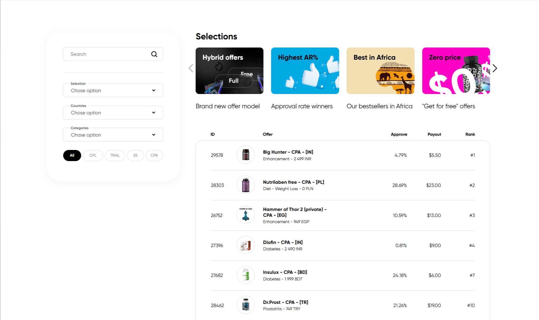 Платформа предлагает передовую среду для маркетологов и владельцев продуктов в области красоты и здоровья, обеспечивая доступ к более чем 3400 прямым предложениям с различными условиями оплаты и доставки. Сервис поддерживает работу в более чем 200 странах и 57 нишах, предоставляя инструменты для роста и развития бизнеса.