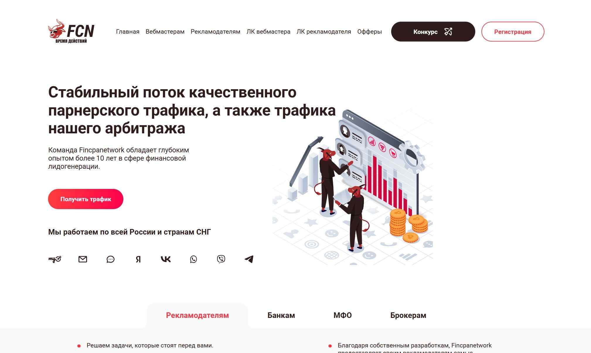 Финансовая партнерская сеть, работает на Россию и Казахстан, более 150 офферов. Принимают любой трафик, кроме фрода. Подходит как опытным вебмастерам, так и новичкам.