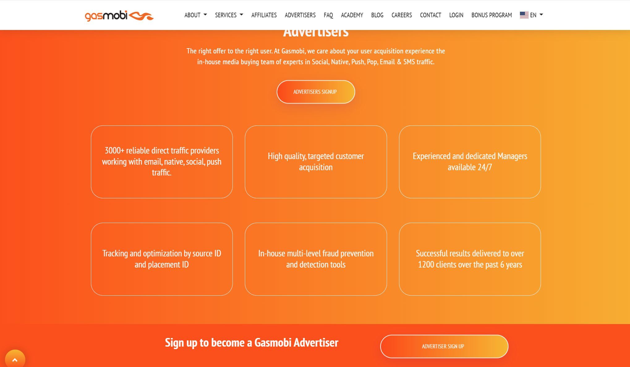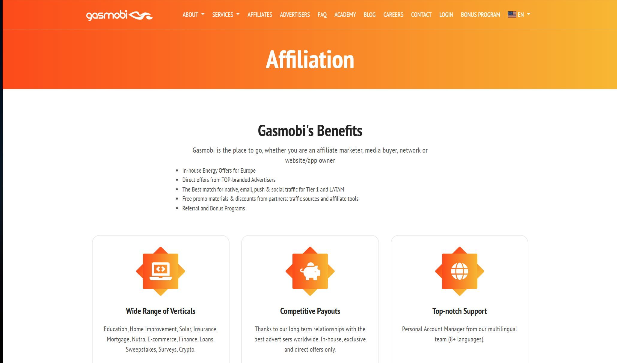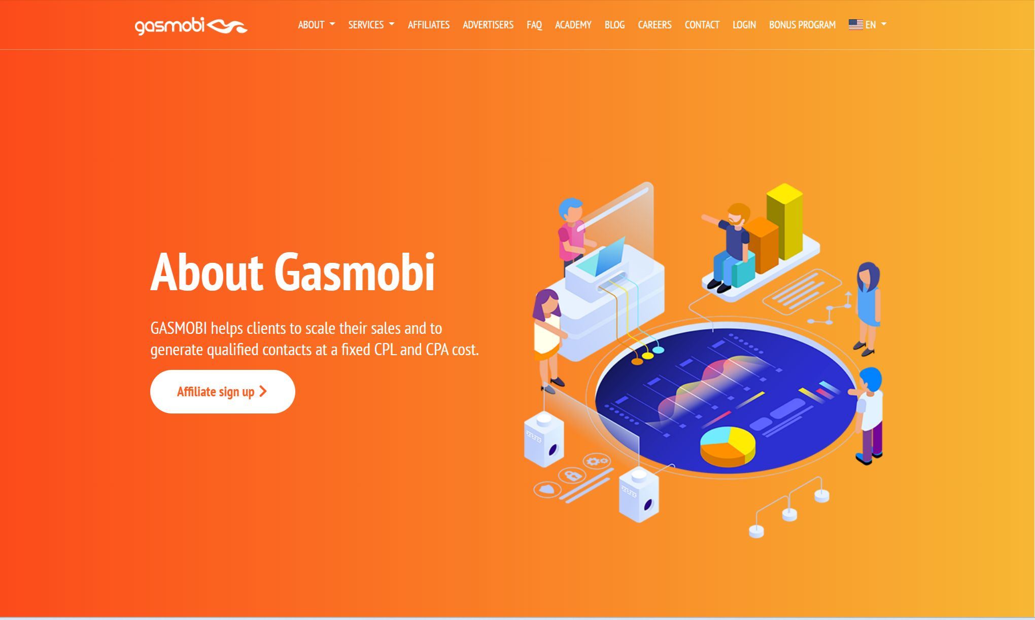 Gasmobi зарубежная партнерская программа для монетизации мобильного трафика, предлагает партнерские программы для арбитражников, веб-мастеров и других пользователей. Работает в различными вертикалями.