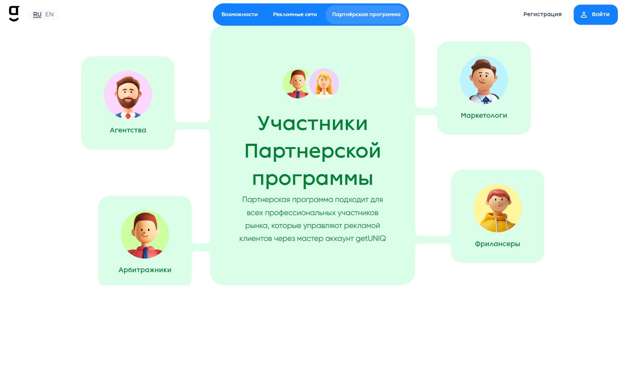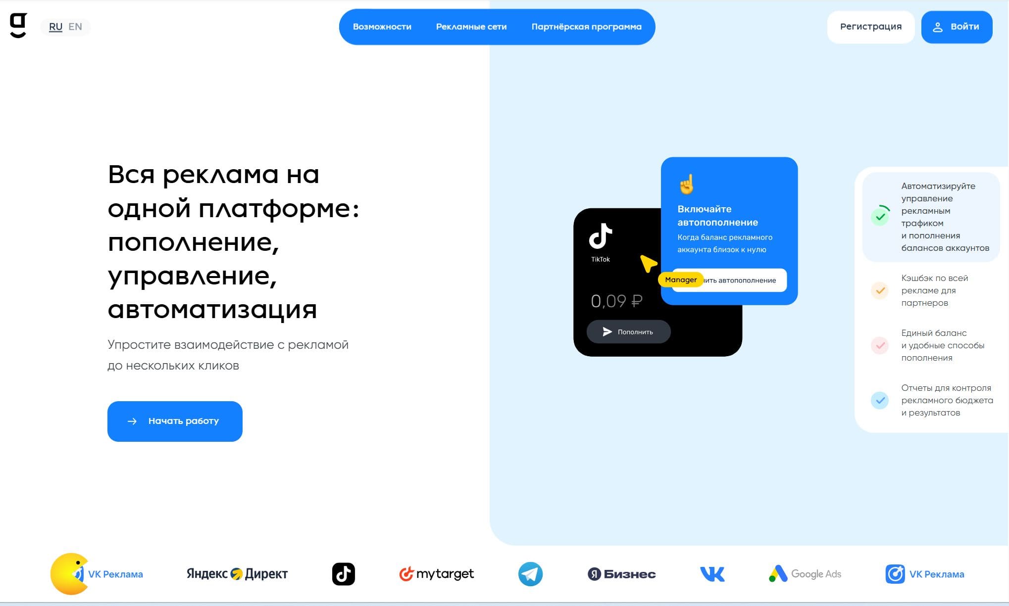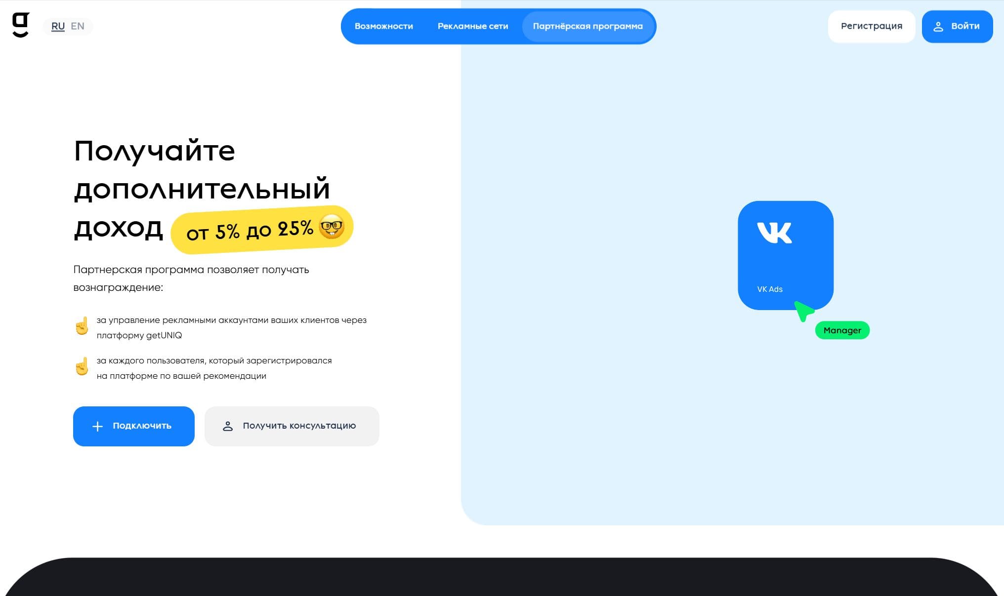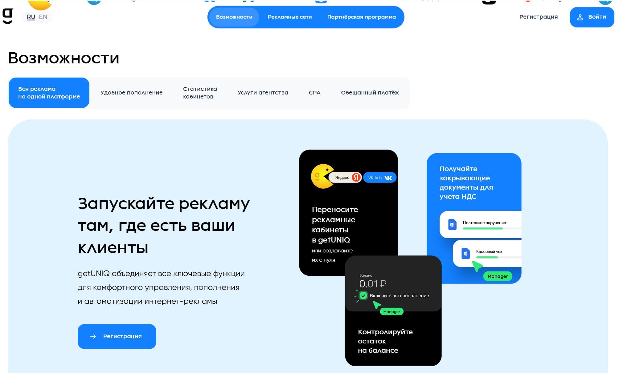 GetUNIQ платформа для работы с рекламой. Платформа упрощает взаимодействие с рекламой, позволяя выполнять основные операции в несколько кликов, позволяет пополнять баланс нескольких рекламных сетей разными способами.