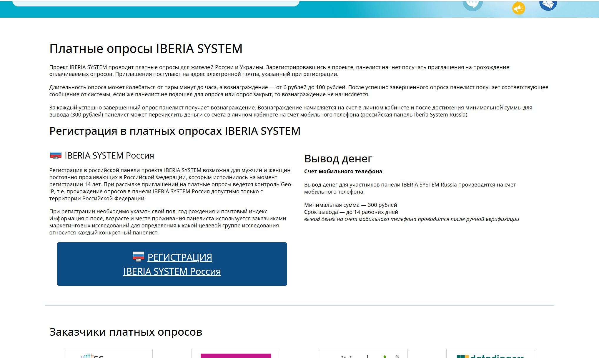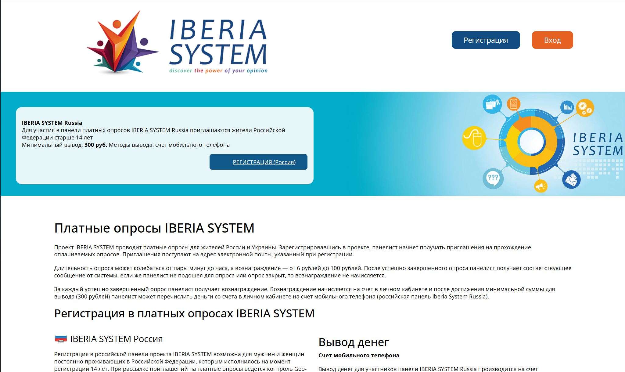 ibersys- онлайн- опросник в России. Проект предлагает возможность участия в платных опросах для жителей России старше 14 лет. После регистрации участники получают приглашения на оплачиваемые опросы по электронной почте. Длительность опроса может колебаться от пары минут до часа, а вознаграждение — от 6 рублей до 100 рублей. Вознаграждение начисляется на счёт в личном кабинете, и после достижения минимальной суммы для вывода (300 рублей) участник может перечислить деньги на счёт мобильного телефона