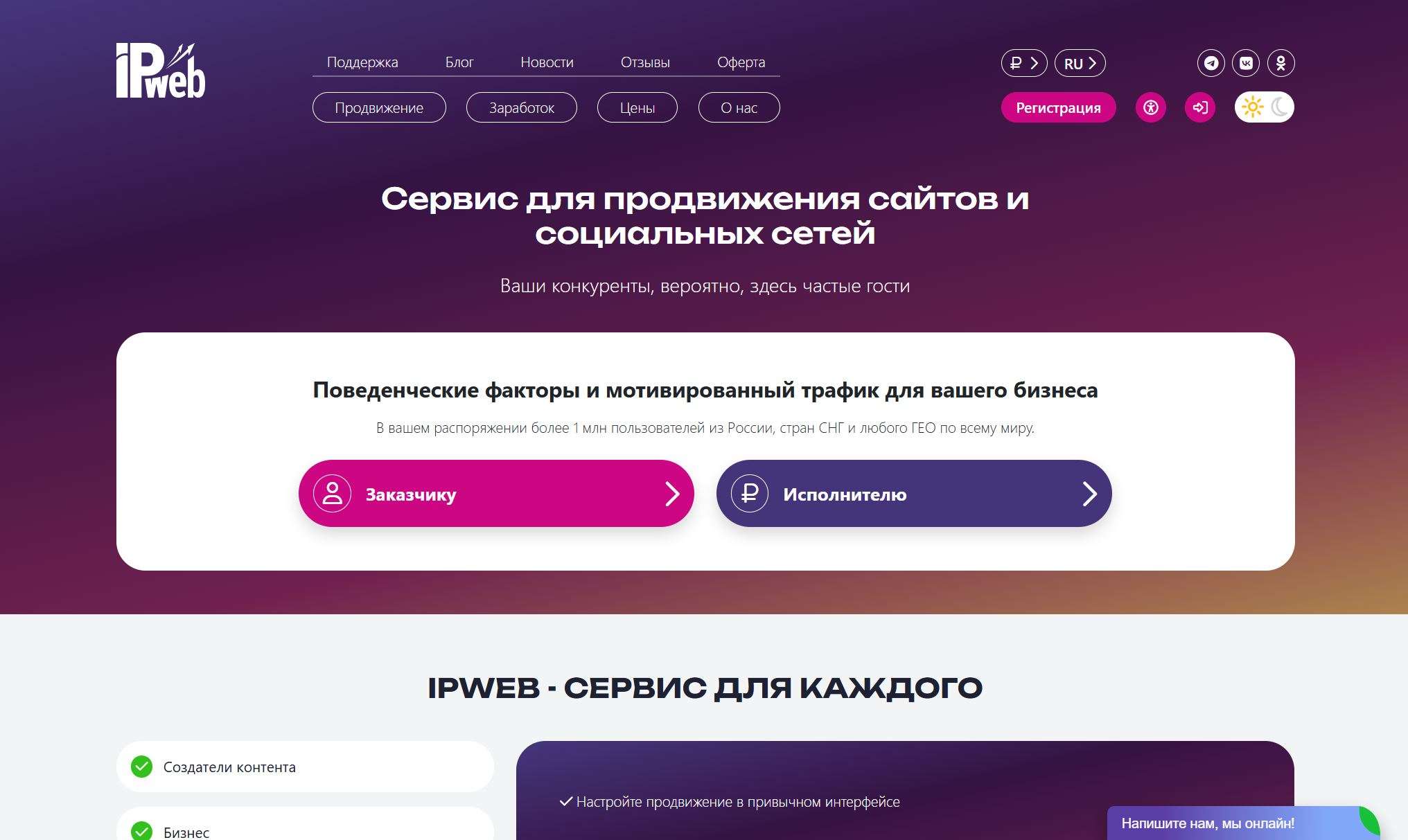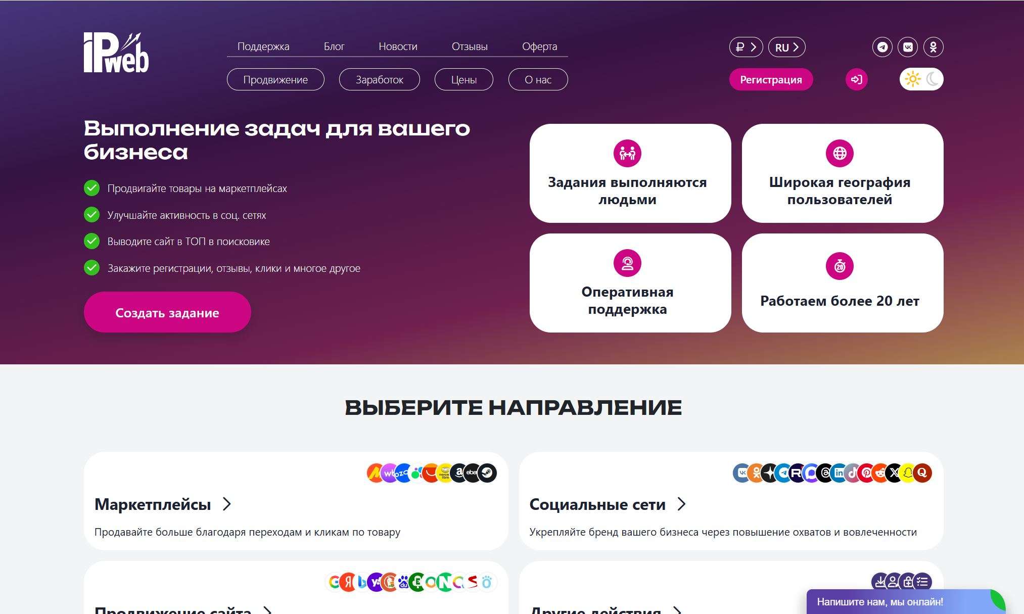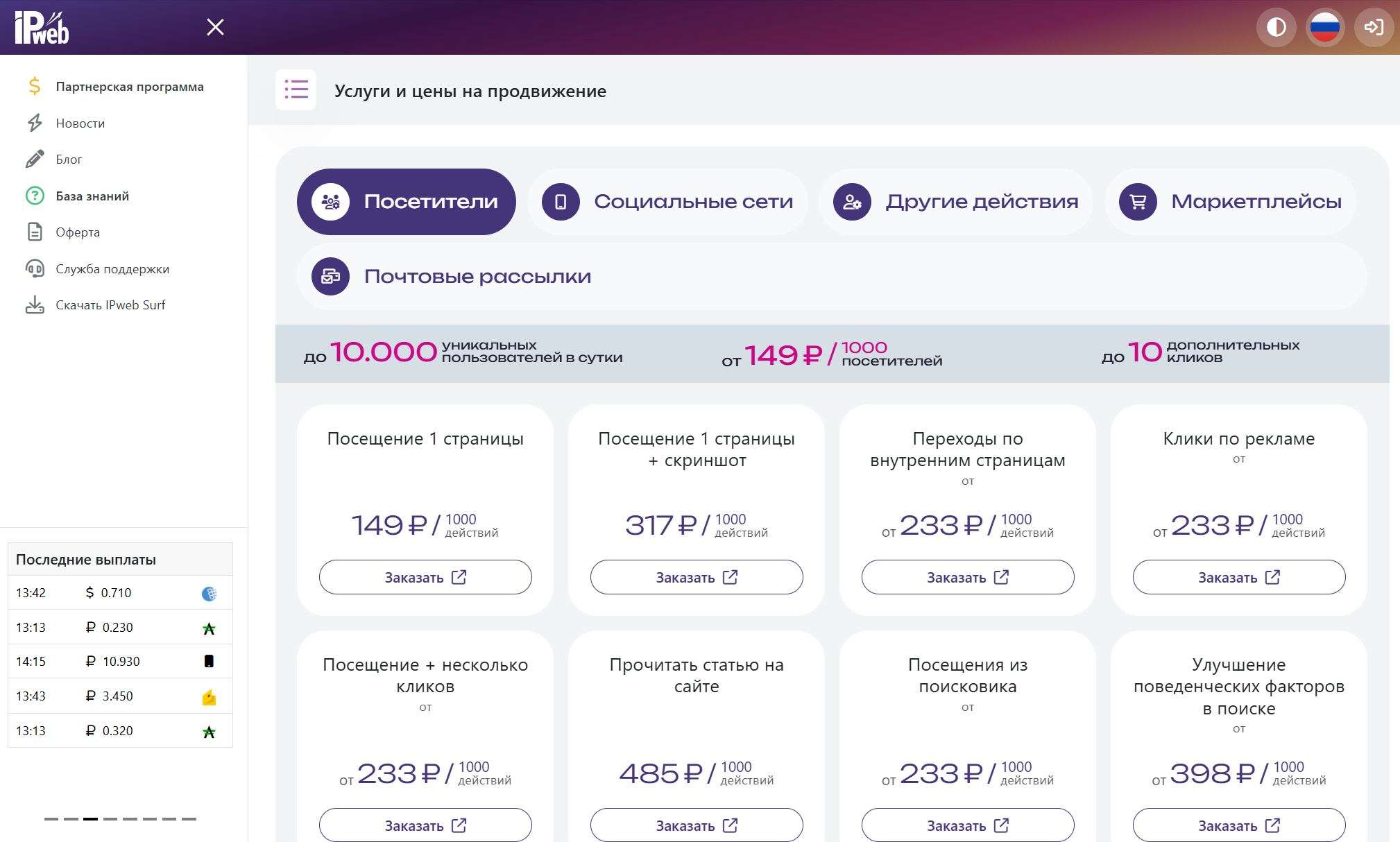 Платформа для продвижения сайтов, социальных сетей и приложений. Рекламодатели получают доступ к мотивированному трафику из разных стран для повышения охватов, вовлечённости и других показателей. Исполнители зарабатывают, выполняя задания, такие как переходы по ссылкам, голоса в социальных сетях, установки приложений и другие действия.