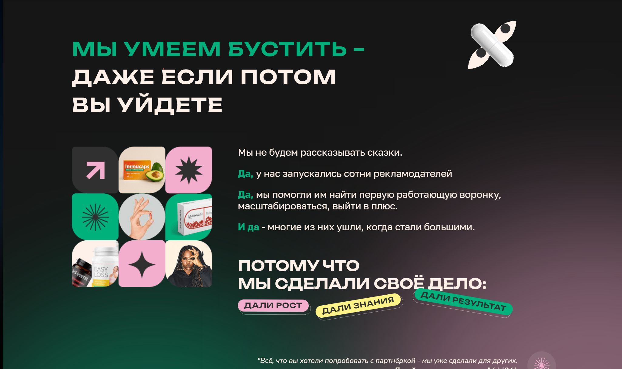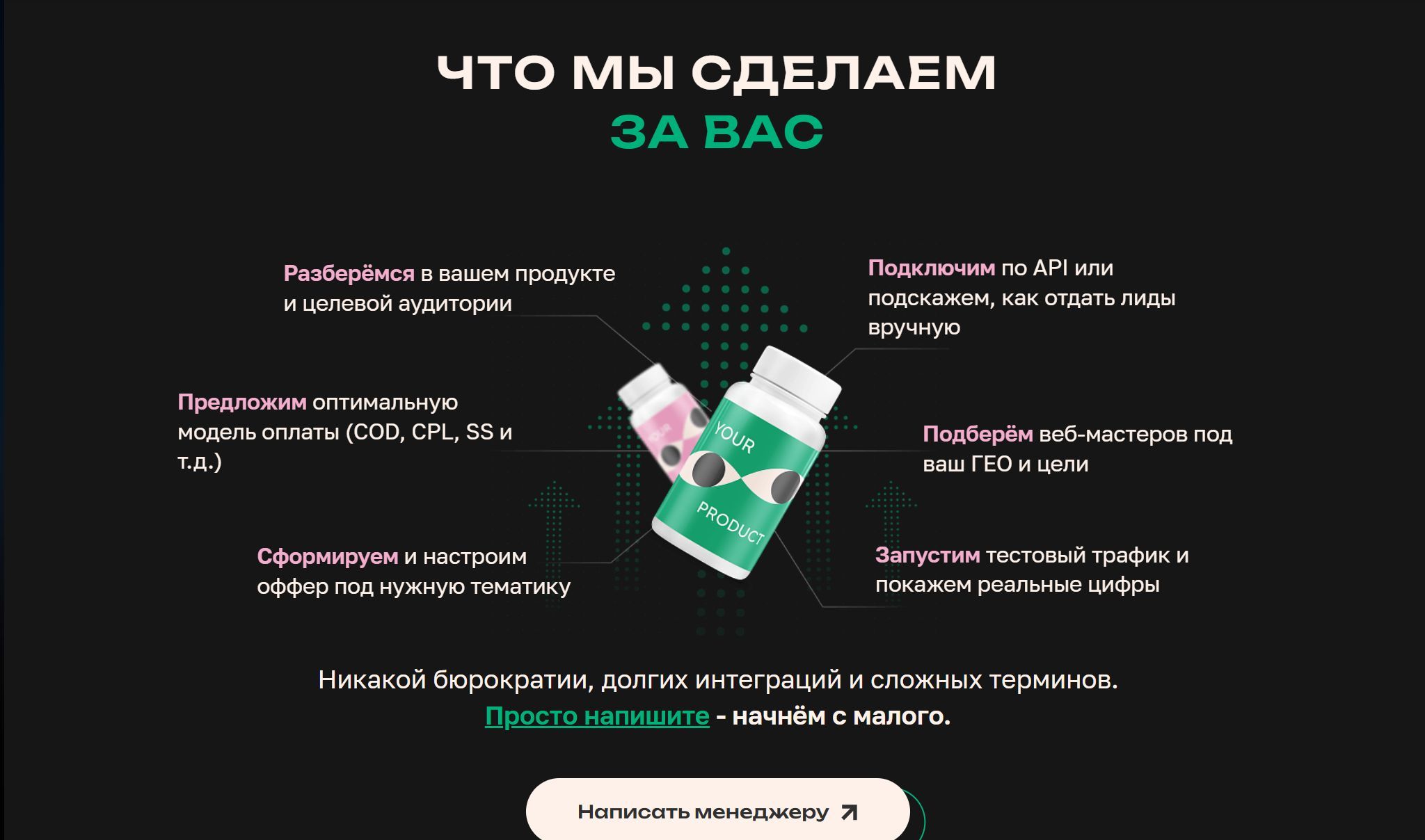 Партнёрская сеть специализируется на nutra-тематике и предлагает широкий выбор офферов от прямых рекламодателей. Здесь можно найти эксклюзивные предложения, выгодные условия для крупных команд и ежедневные выплаты. Платформа обеспечивает быструю регистрацию и старт работы за один день.