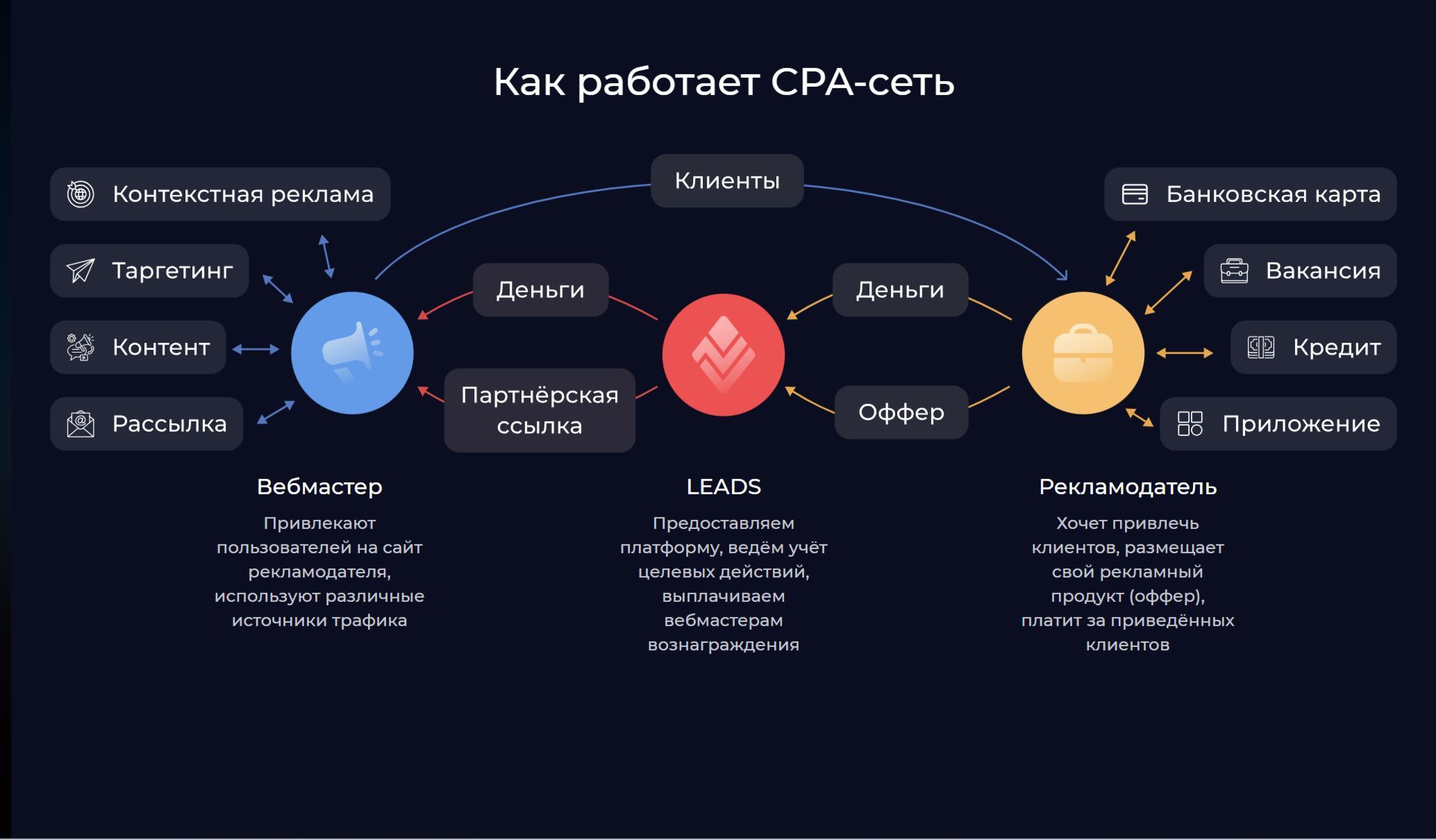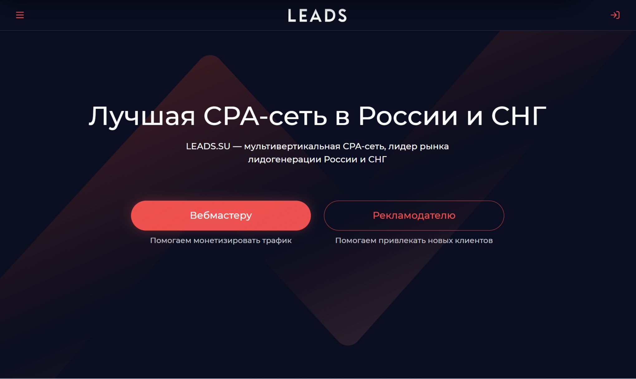 Платформа для вебмастеров и рекламодателей, где они могут сотрудничать в рамках CPA-сети. Подчёркивают длительный опыт работы — 14 лет, а также внушительные статистические показатели, такие как количество заработанных средств вебмастерами, подключённых офферов и конверсий. Платформа предлагает различные инструменты экосистемы, бонусы и награды за трафик, а также возможность управления рекламными бюджетами в едином личном кабинете. Акцент делается на персональных условиях для вебмастеров, быстрой помощи от менеджера и комфорте работы с сетью.
