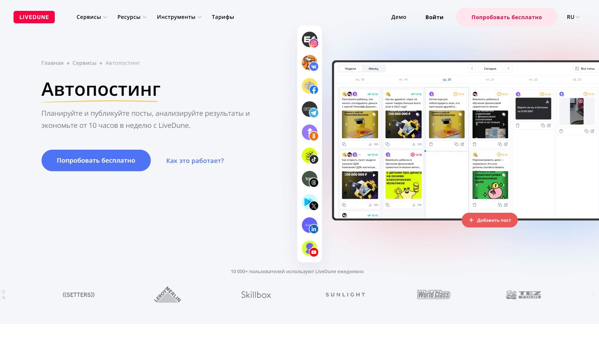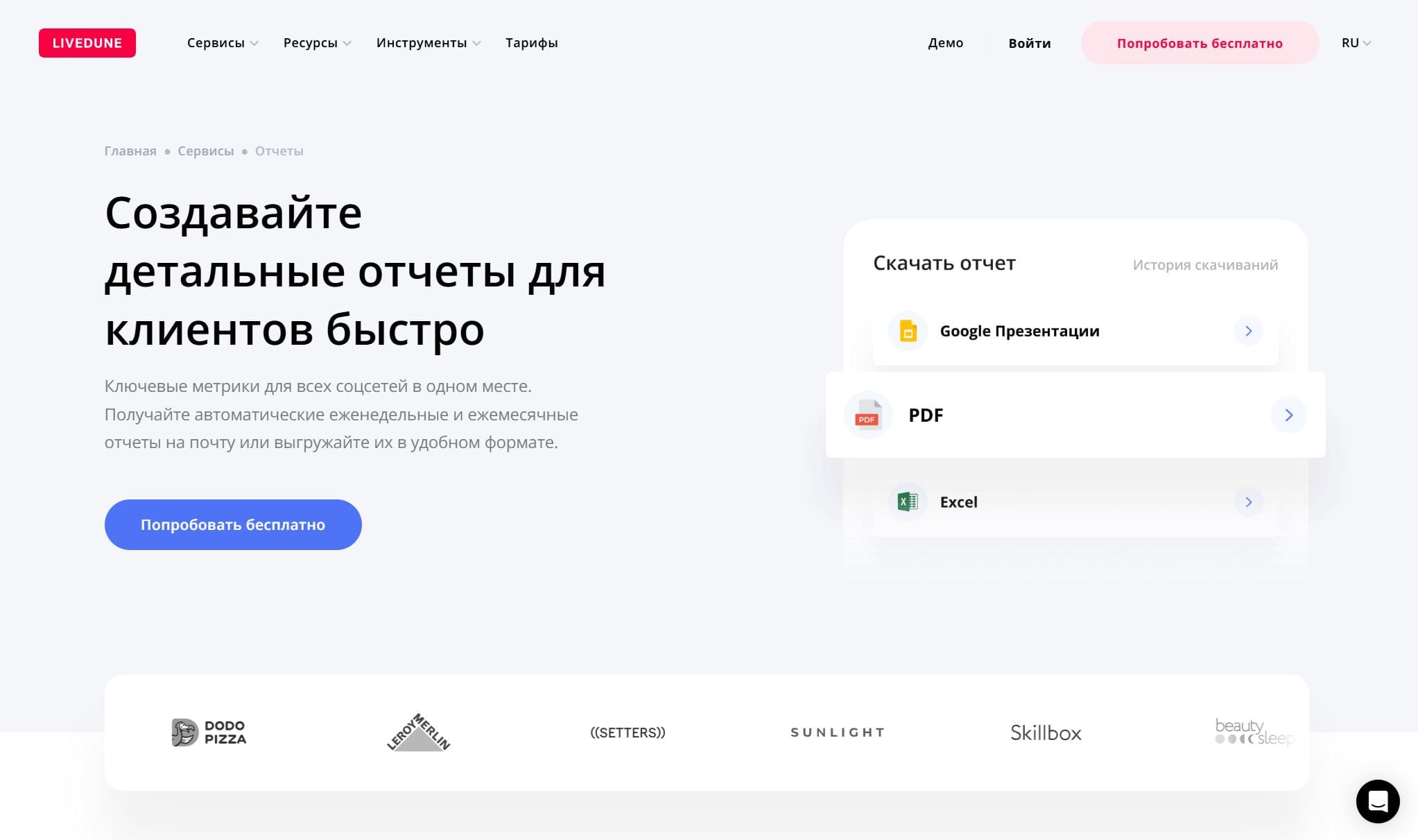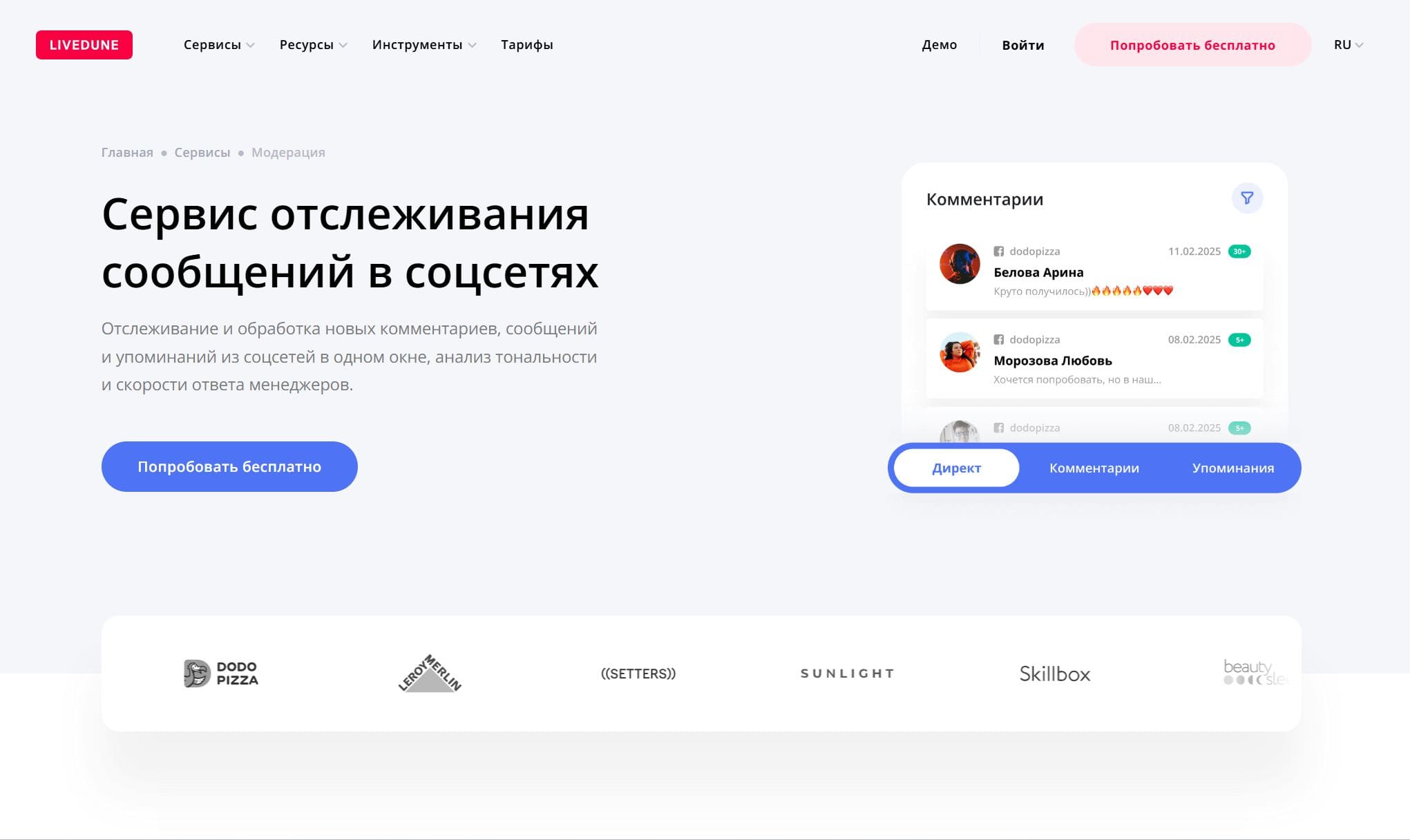 Инструмент для управления соцсетями позволяет собирать статистику, публиковать посты и stories, модерировать комментарии и сообщения, а также создавать SMM-отчёты. Сервис даёт возможность сравнивать свои показатели с данными конкурентов.