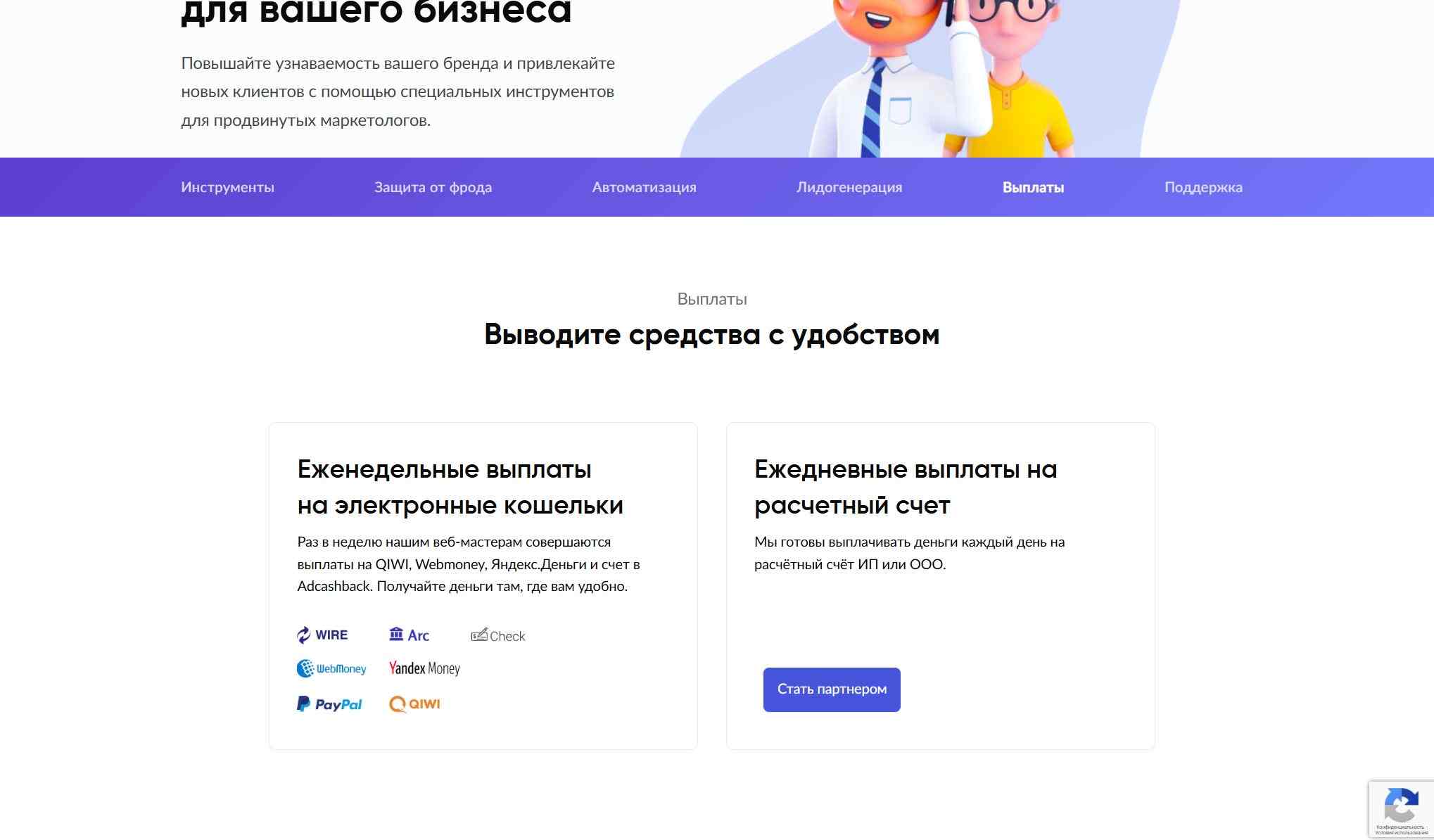 Платформа предоставляет рекламодателям возможность находить веб-мастеров для привлечения целевых звонков, а веб-мастерам — монетизировать свой трафик через партнёрские программы. Сервис предлагает инструменты для защиты от фрода, автоматизации процессов, быстрой выплаты вознаграждений, лидогенерации и персональной поддержки.