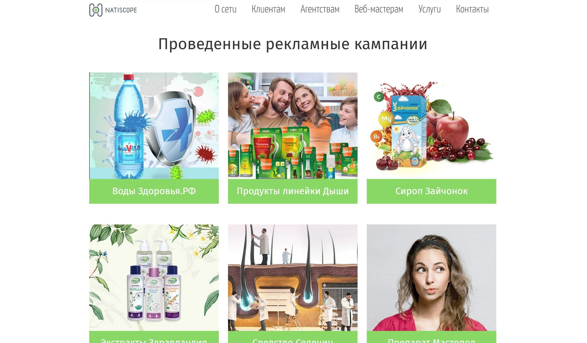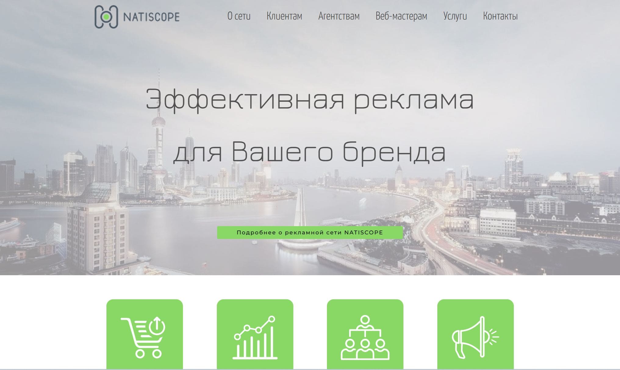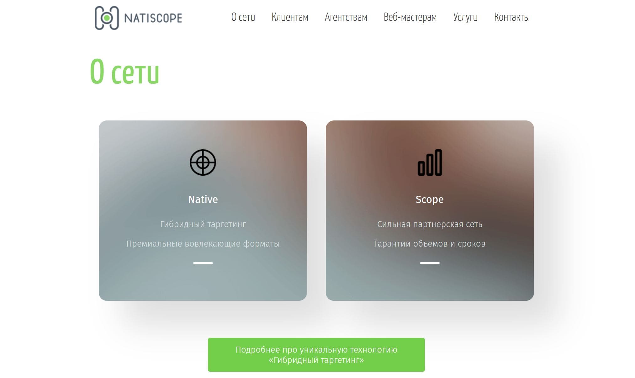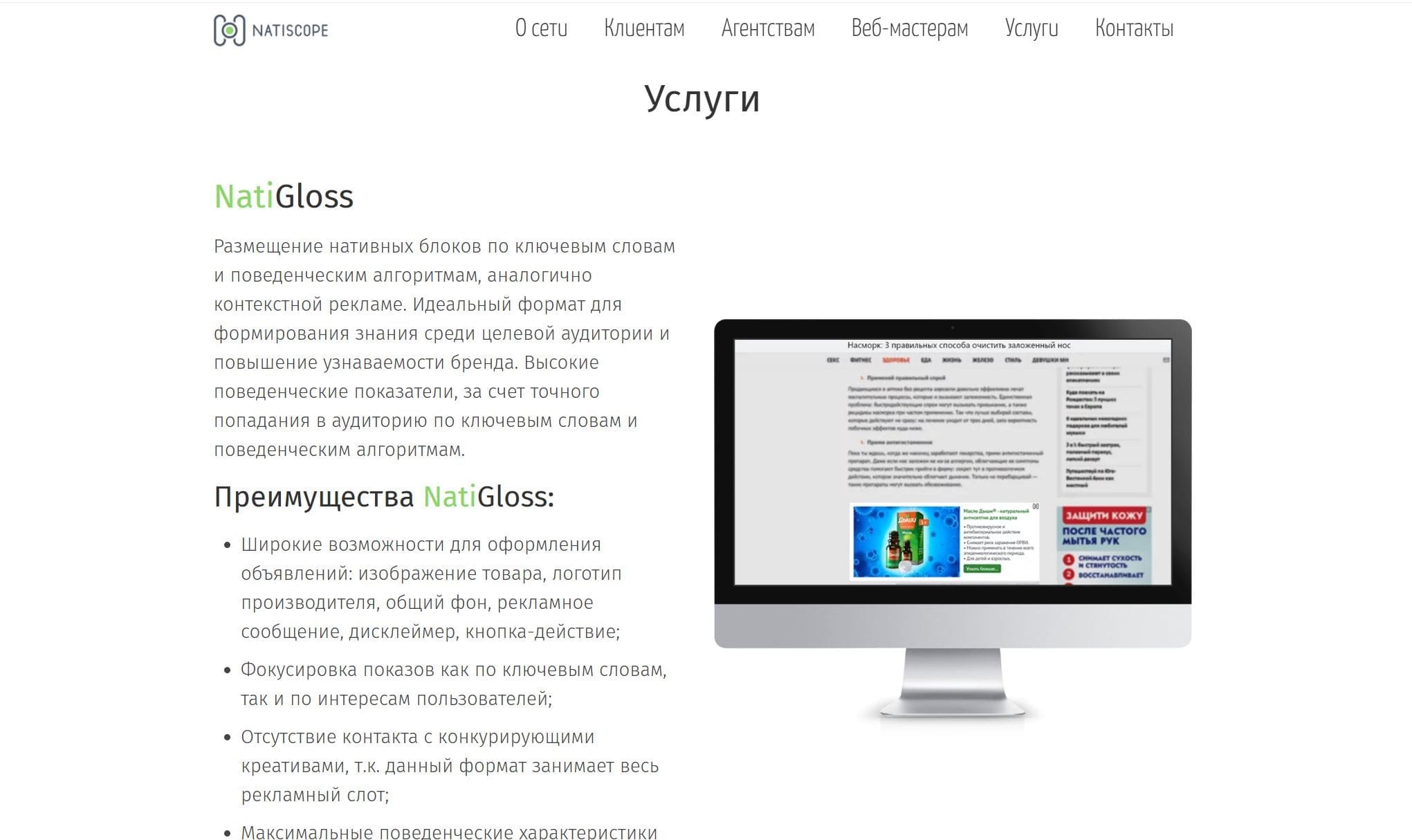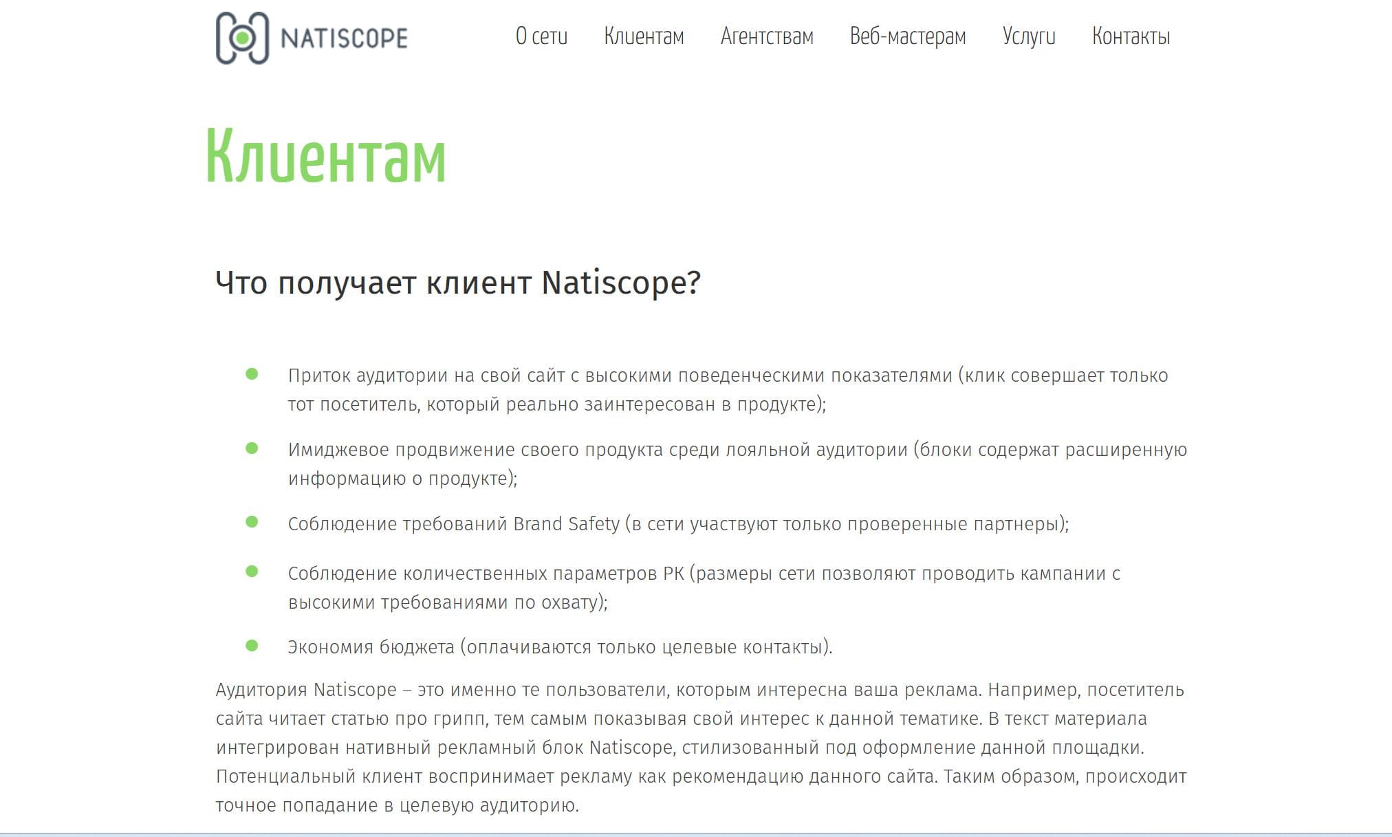 Natiscope- платформа нативной рекламы. Компания предлагает различные услуги для продвижения брендов и продуктов. Среди них — размещение нативных блоков по ключевым словам и поведенческим алгоритмам, продвижение линейки продуктов с кнопкой перехода на страницу для оформления заказа, а также исследование воздействия рекламных сообщений на узнаваемость бренда и спрос.