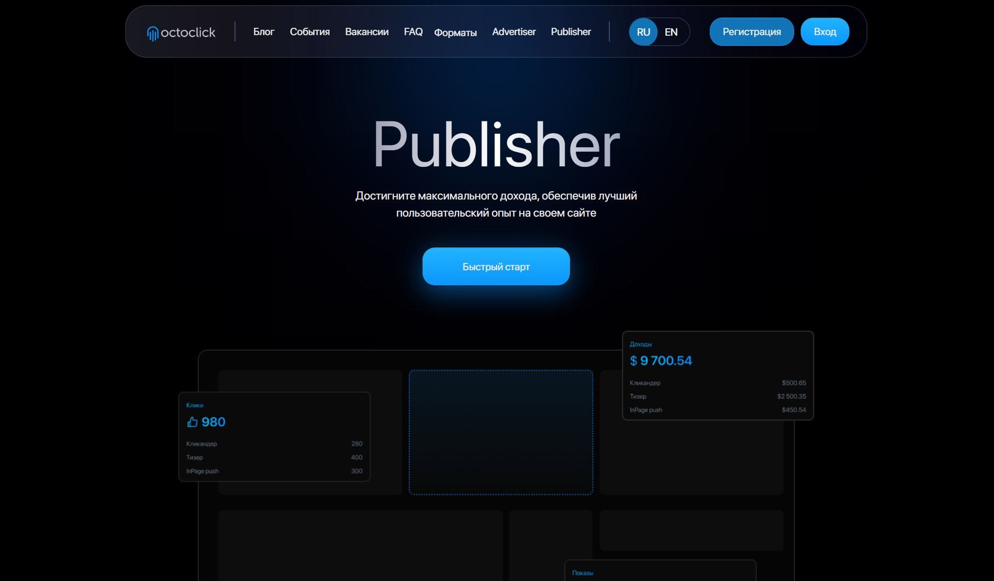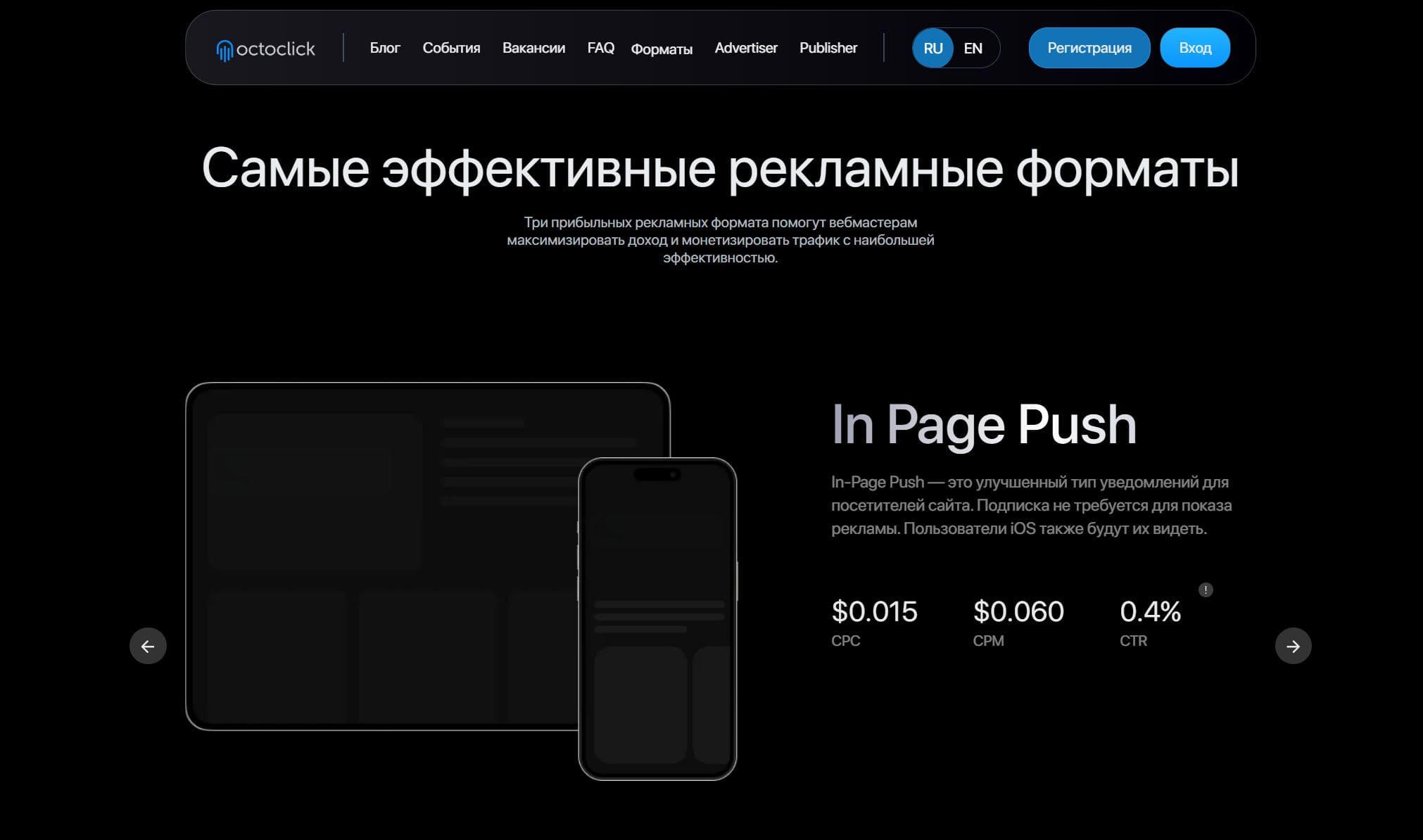 Рекламная сеть, которая предлагает различные форматы рекламы, включая In-page Push, Native и Popunder. Преимущества для рекламодателей и паблишеров, такие как прямое сотрудничество с сайтами, разнообразие рекламных форматов, широкий выбор опций таргетинга и удобные условия пополнения баланса и вывода средств.