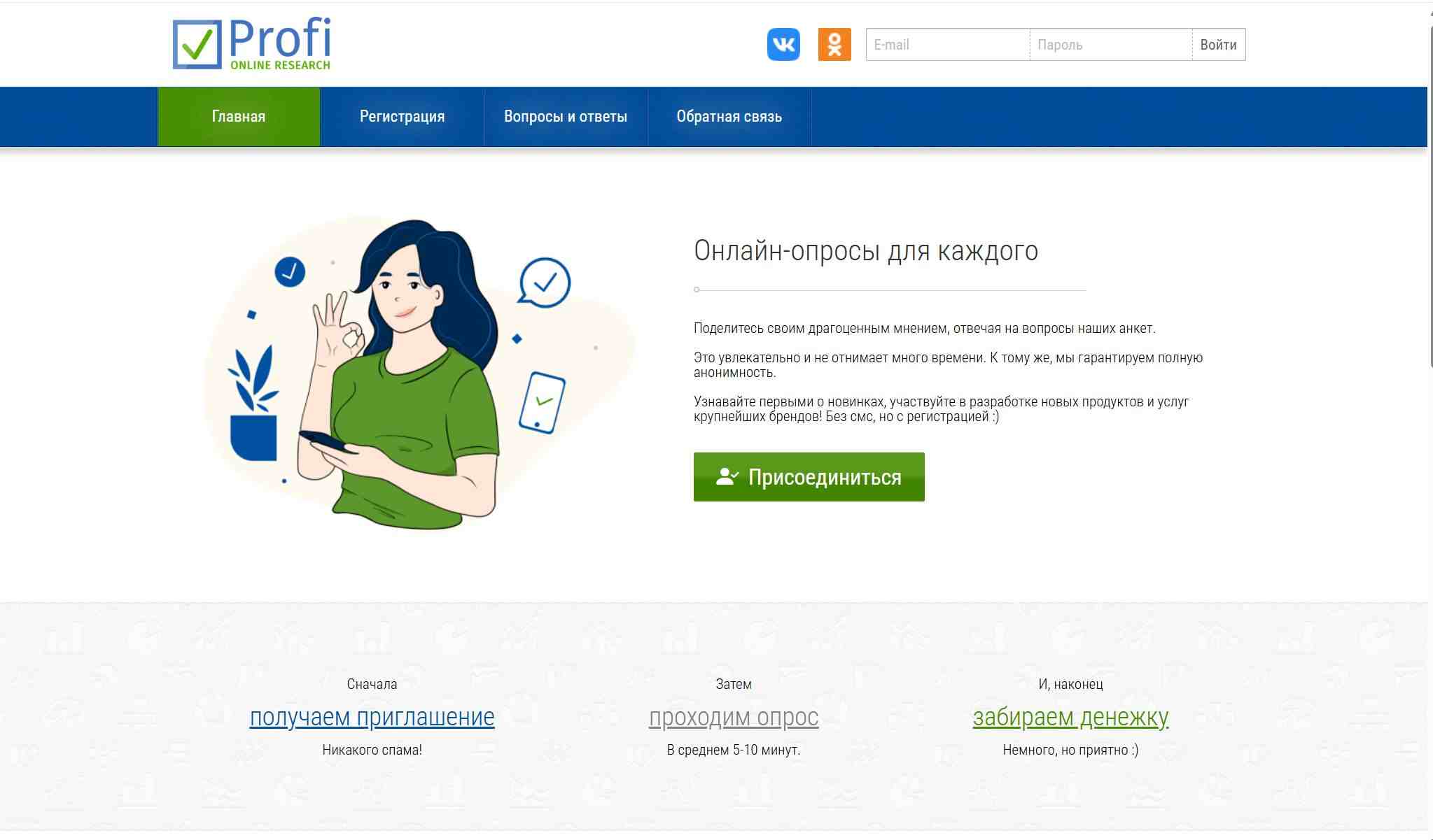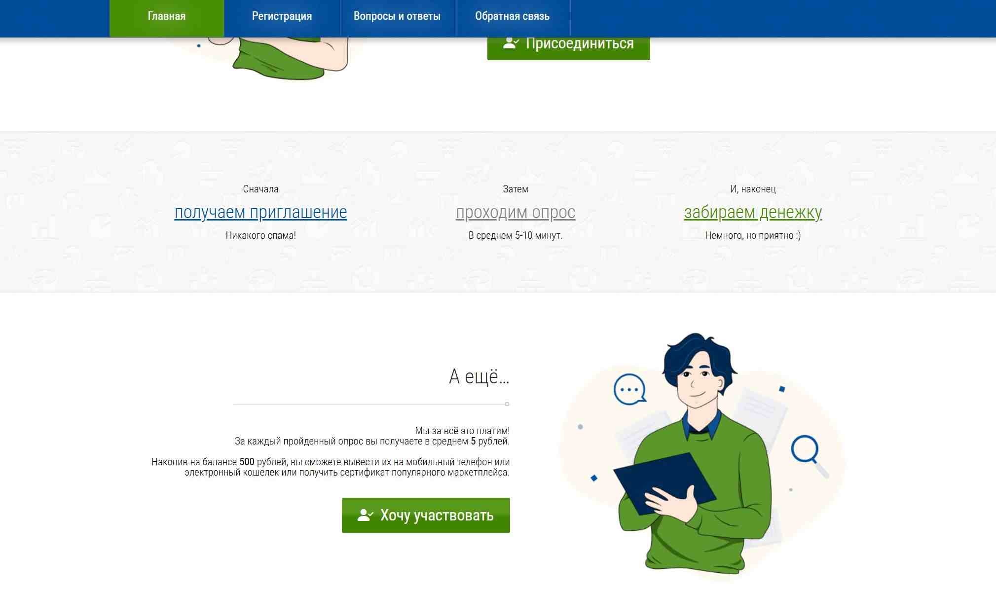Платформа для проведения онлайн-опросов, чтобы влиять на разработку новых продуктов и услуг крупнейших брендов. Участие в опросах занимает в среднем 5–10 минут, а за каждый пройденный опрос начисляется вознаграждение. Накопив определённую сумму, можно вывести деньги на мобильный телефон или электронный кошелёк или получить сертификат популярного маркетплейса.