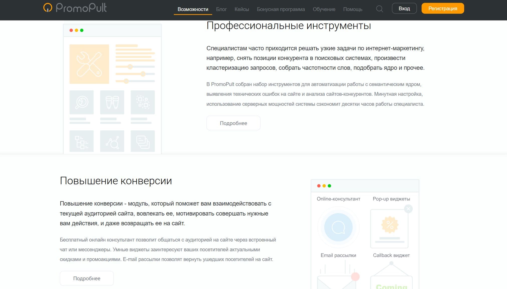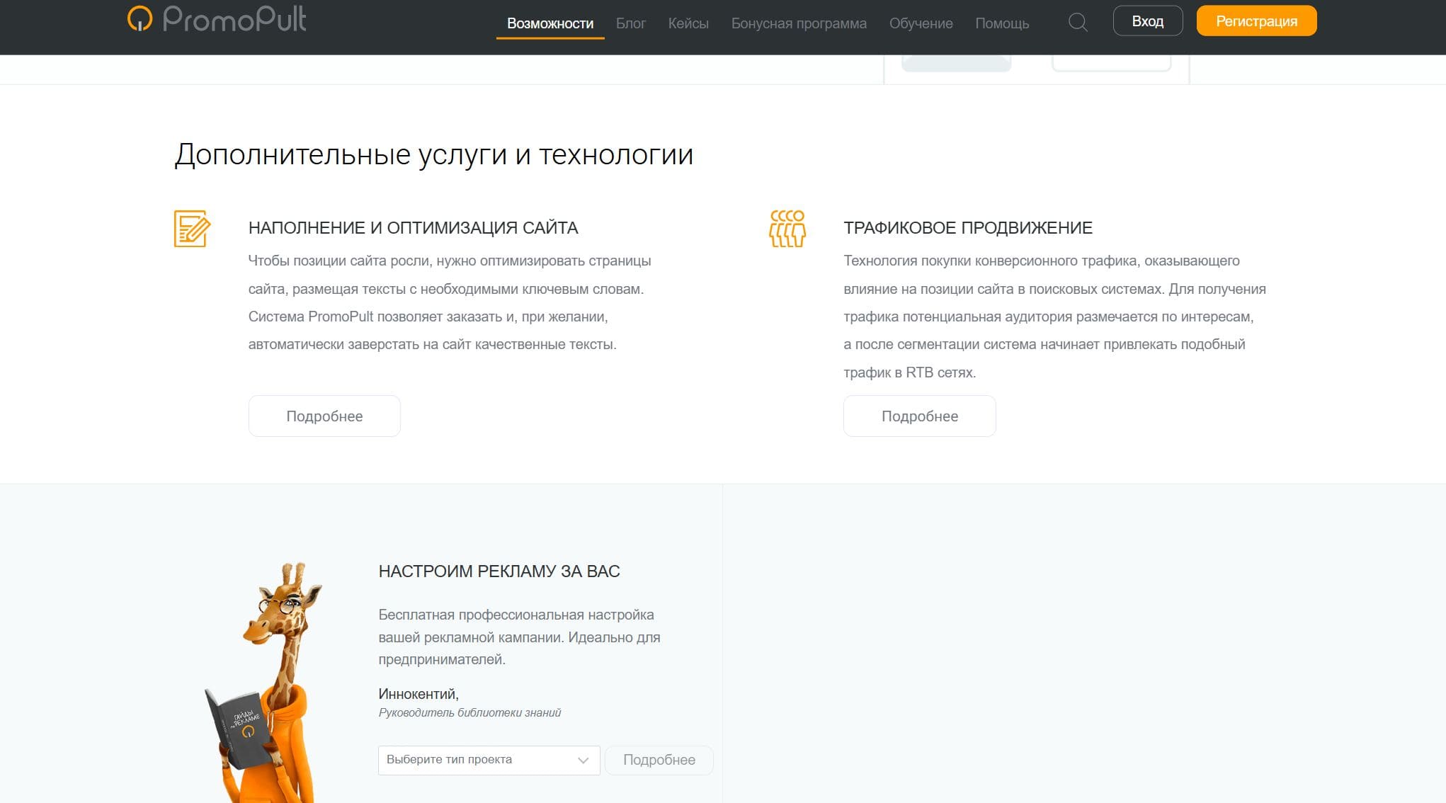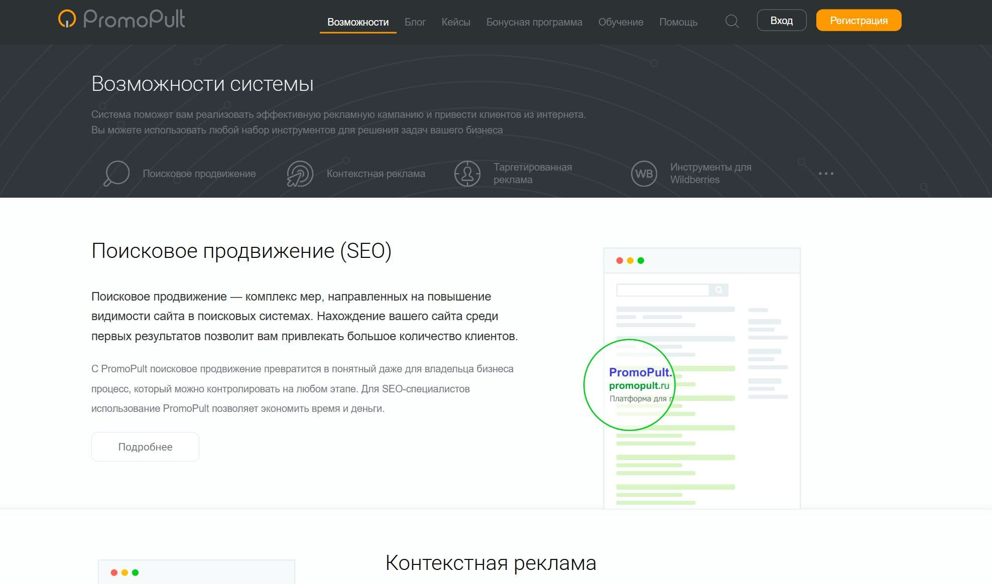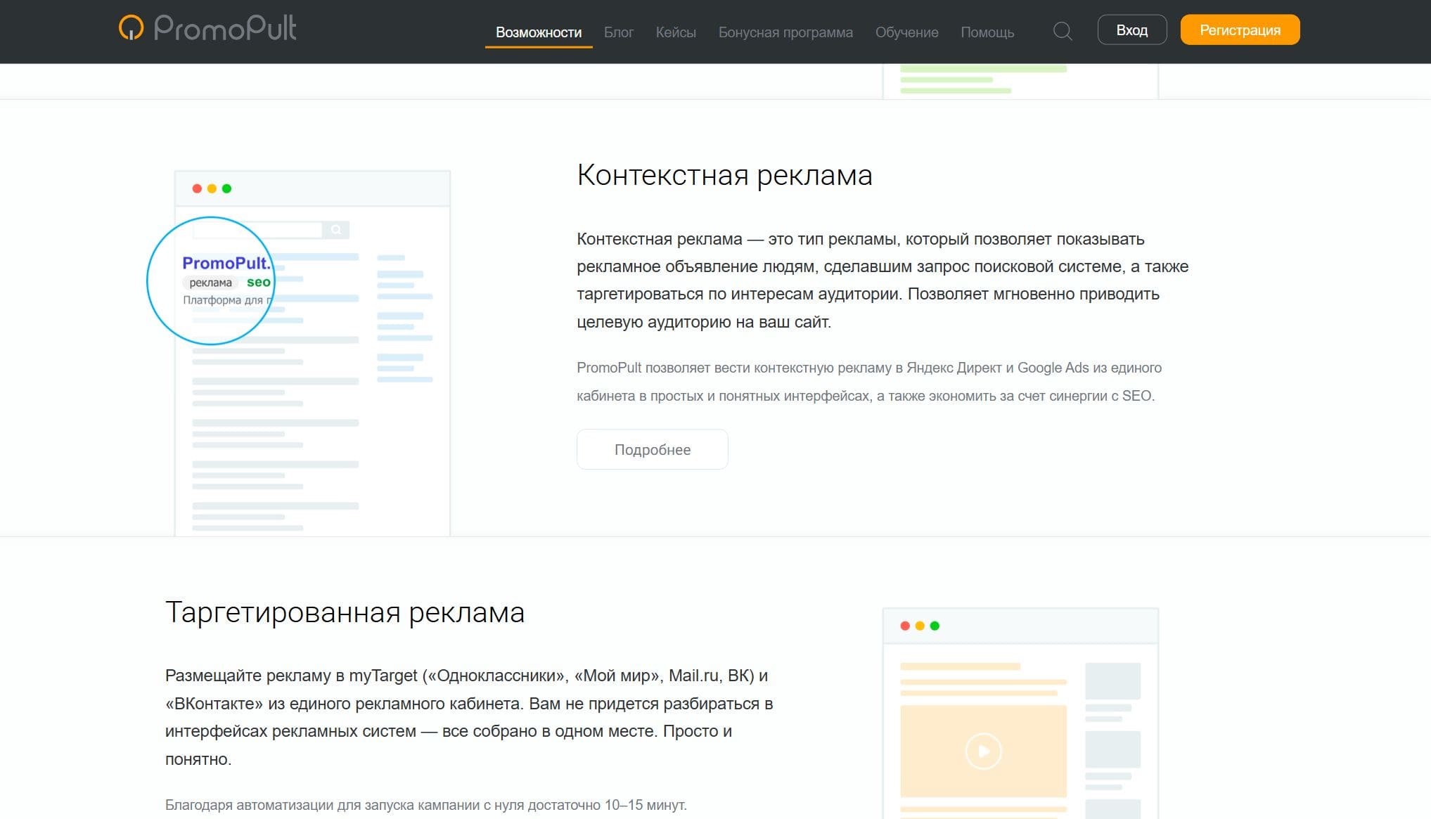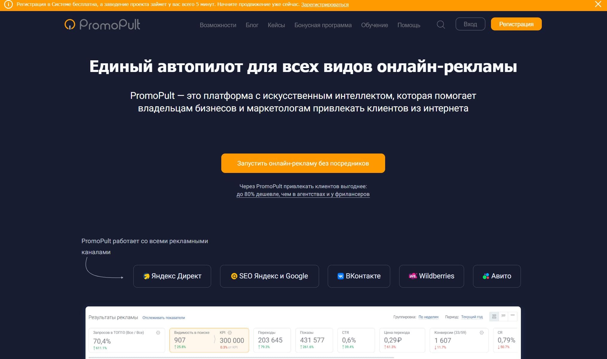 Платформа предоставляет комплексные решения для интернет-маркетинга. Она помогает автоматизировать рутинные задачи, связанные с настройкой и ведением рекламы, и предоставляет удобные инструменты для анализа эффективности кампаний. Сервис сотрудничает с крупнейшими рекламными системами и предлагает решения, которые подходят как начинающим предпринимателям, так и опытным маркетологам