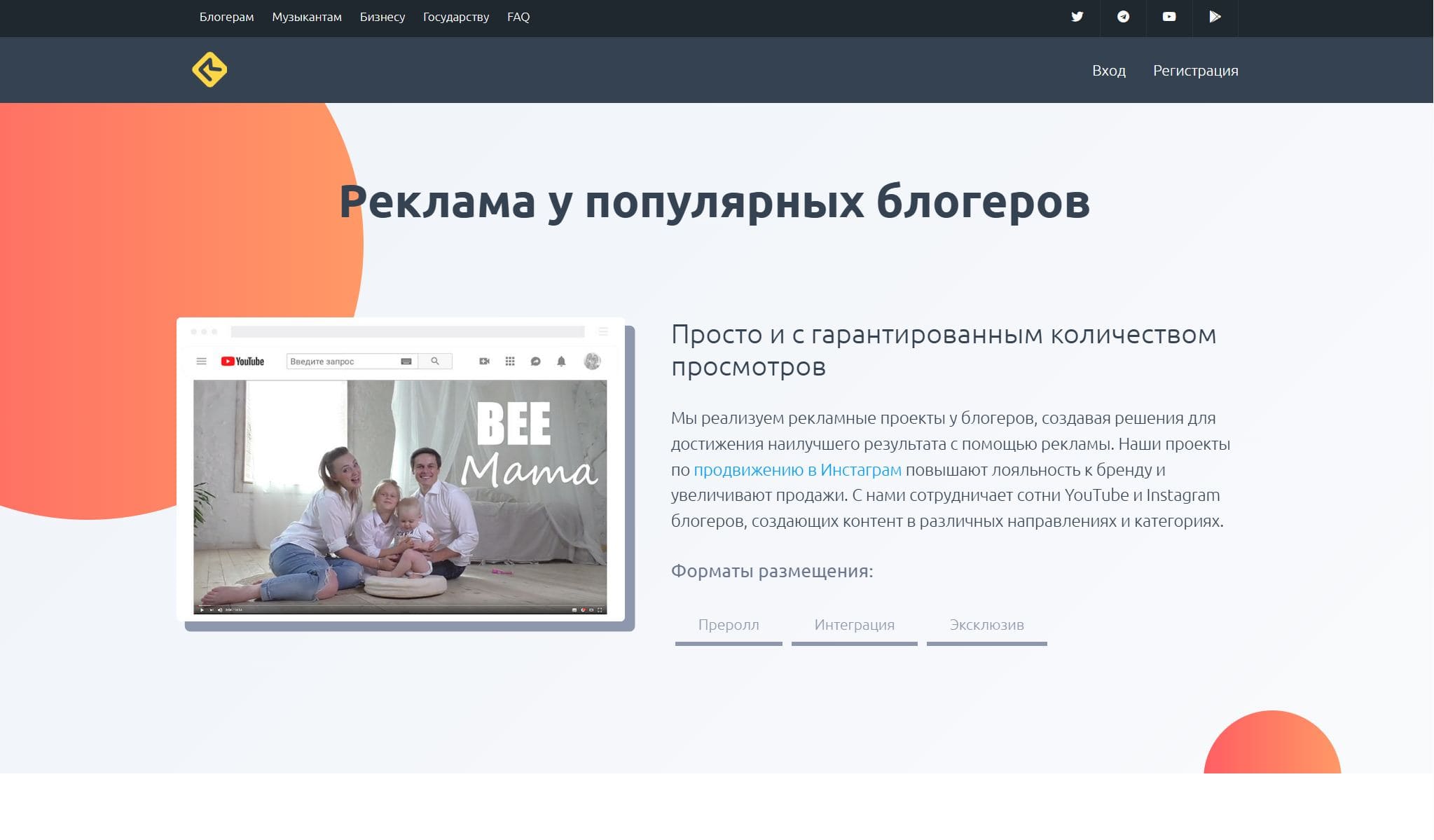 Платформа предлагает решения для продвижения видеороликов в социальных сетях. С её помощью можно настроить таргетинг по различным параметрам и разместить контент в популярных группах и на страницах. Сервис работает с частными рекламодателями и крупными агентствами, обеспечивая вывод роликов в тренды, предоставление детальной статистики и гарантию на добавляемые социальные показатели.