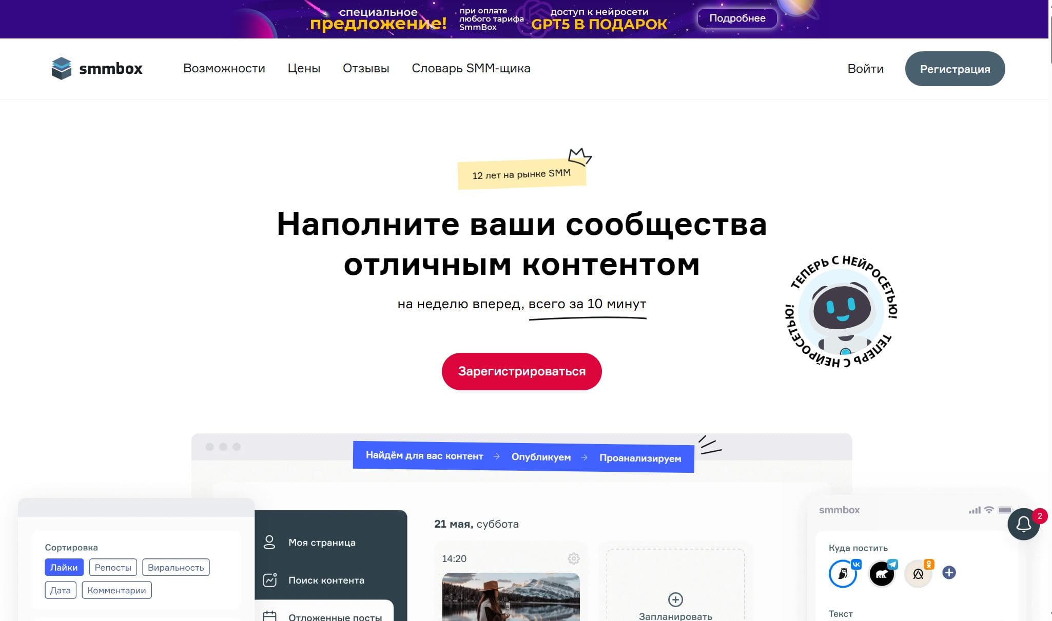 Платформа позволяет эффективно управлять контентом в социальных сетях. Она предлагает функции пакетной загрузки и кросспостинга, поиска контента, работы с нейросетью для создания и улучшения текстов, а также инструменты для работы в команде и анализа эффективности публикаций. Поддерживается публикация в 11 соцсетях.