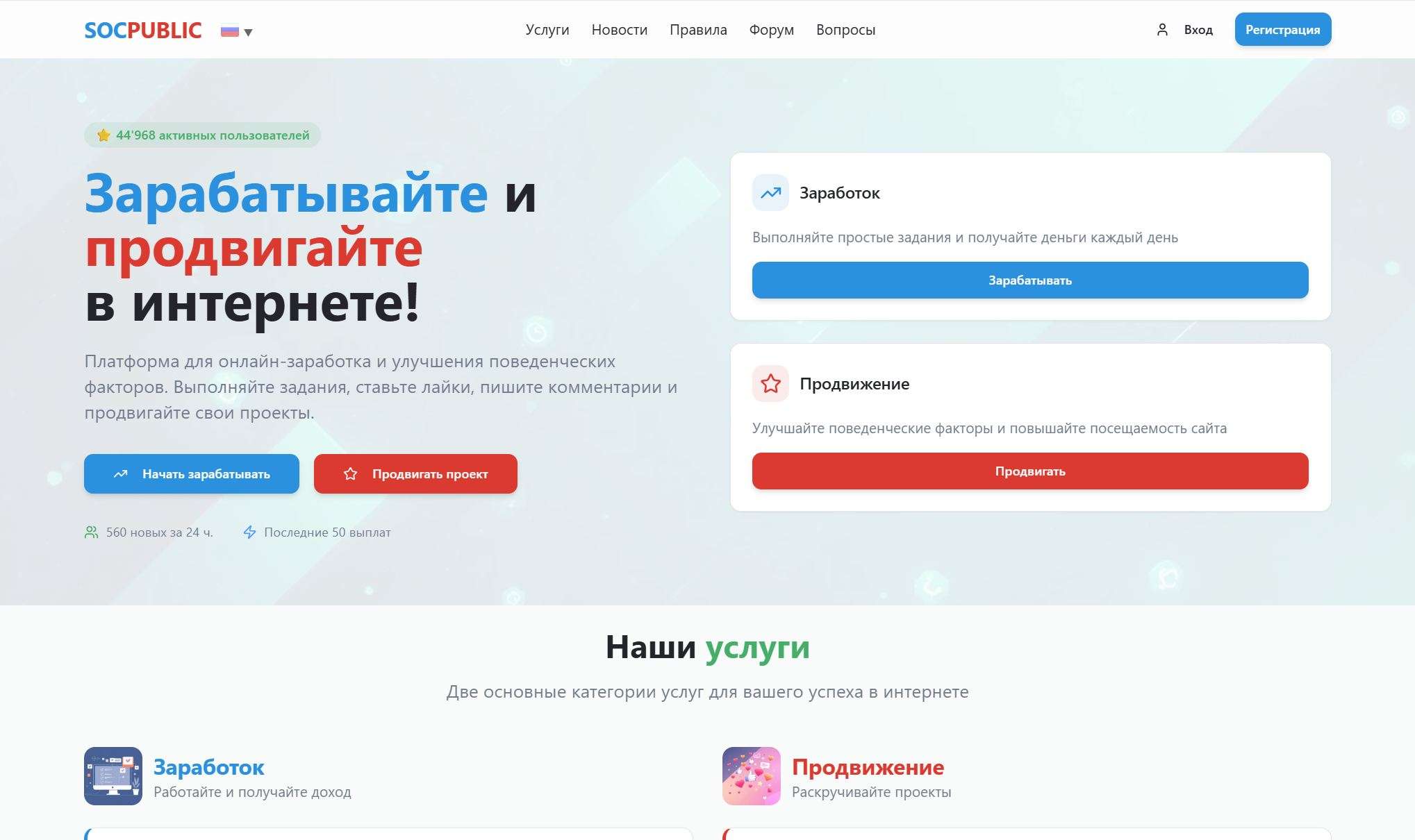 SocPublic- биржа выполнения небольших заданий в интернете. Чем выше ваша активность, тем больше возможностей открывается перед вами. Участвуйте в регулярных конкурсах, получайте ежедневные бонусы и приглашайте друзей. Уникальная система уровней и достижений позволяет отслеживать свой прогресс и получать дополнительные преимущества.