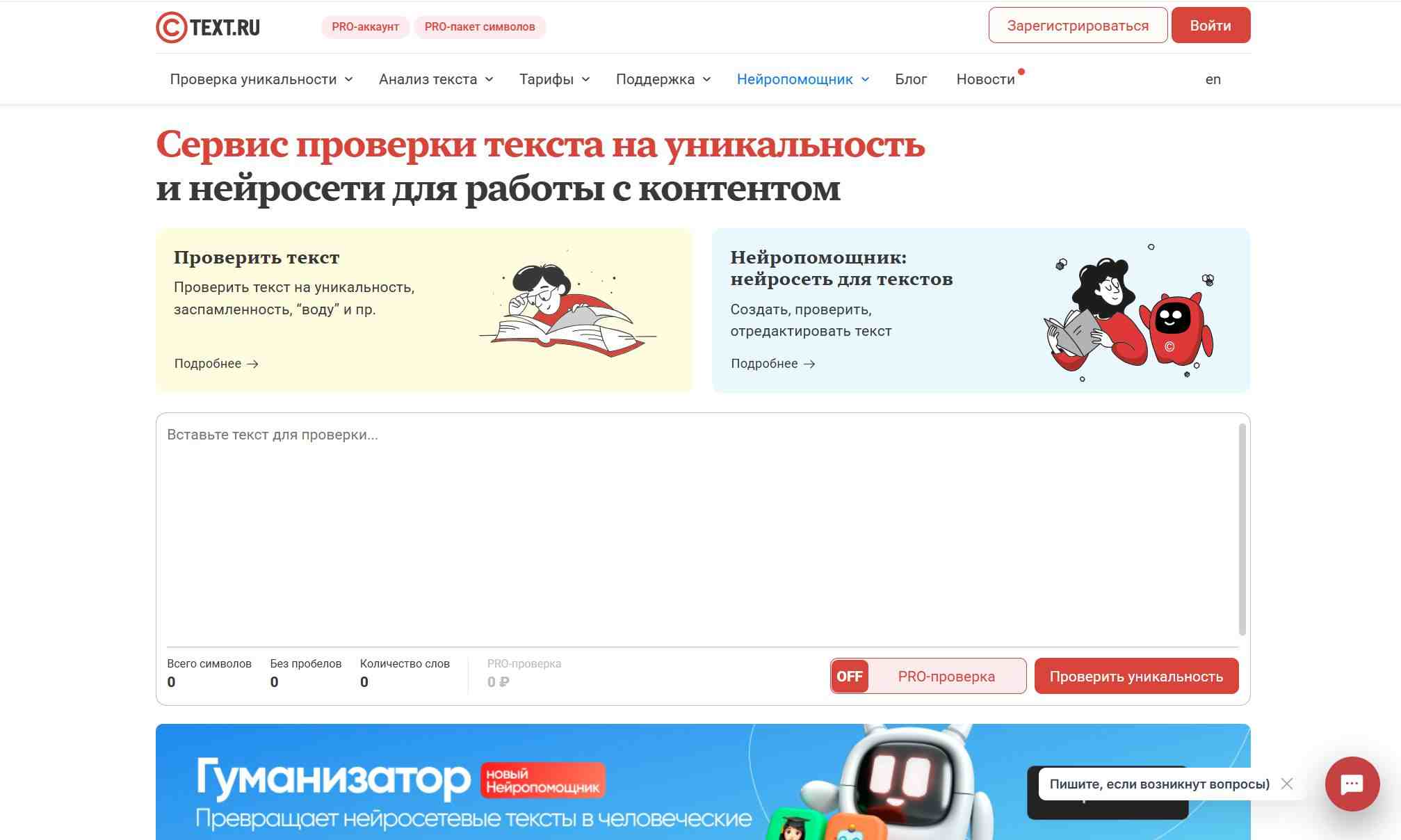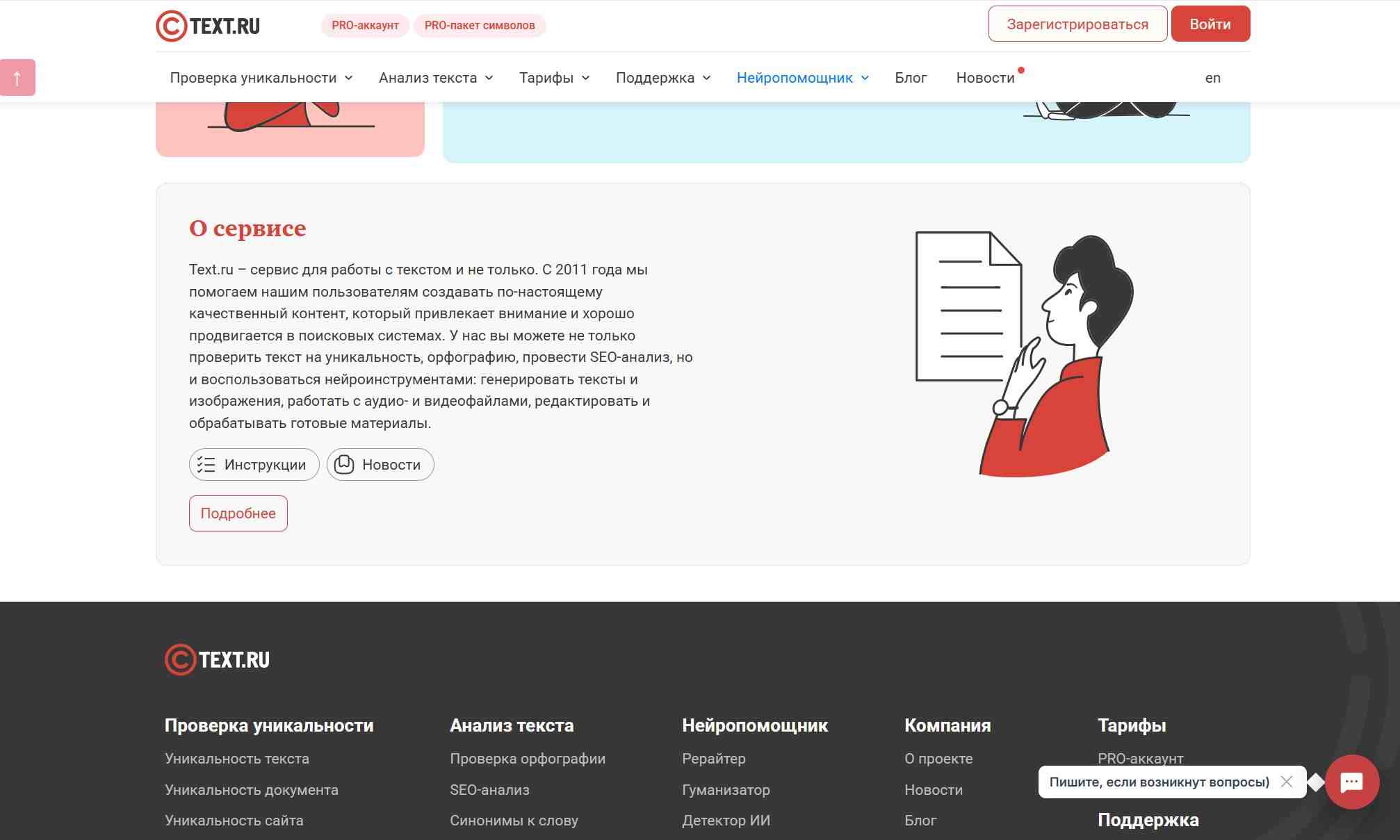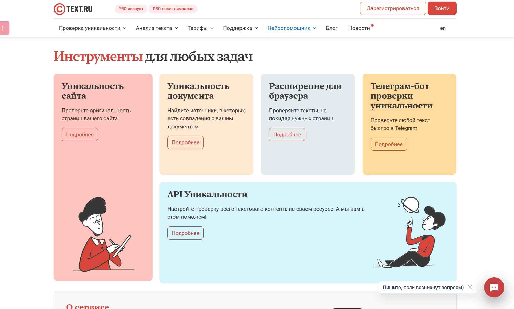 text.ru- сервис предоставляет инструменты для проверки уникальности текста, орфографии, SEO-анализа и использования нейросетей для работы с контентом. Пользователи могут проверять тексты на уникальность, заспамленность и наличие «воды», а также использовать нейроинструменты для генерации текстов и изображений, работы с аудио- и видеофайлами.