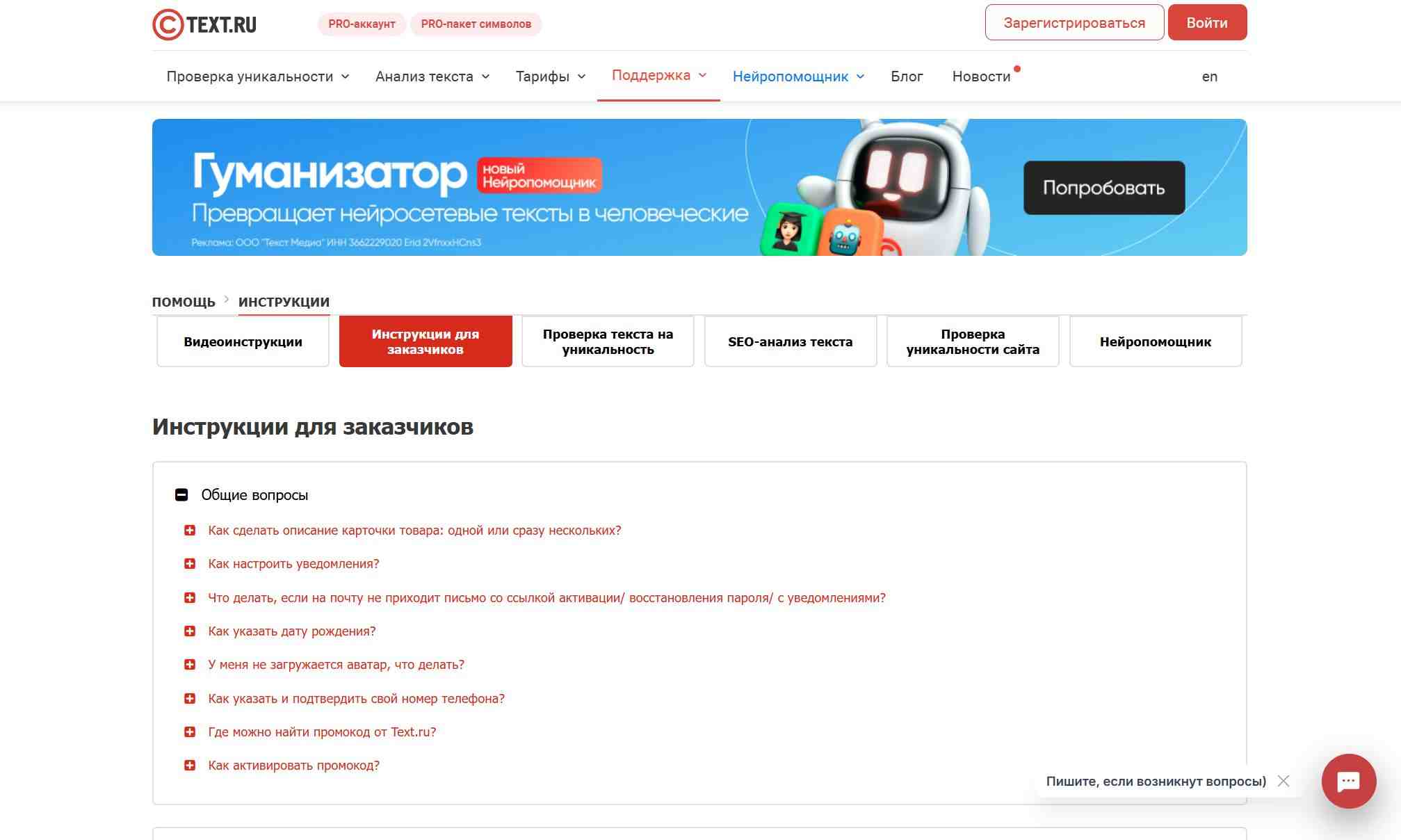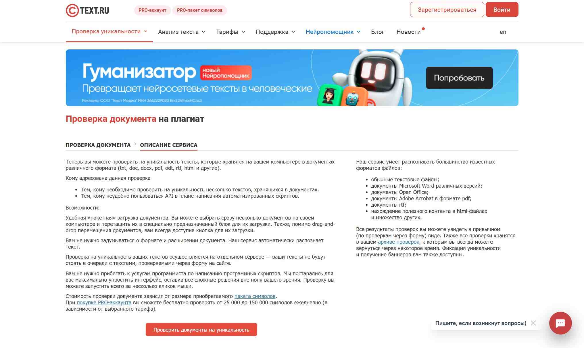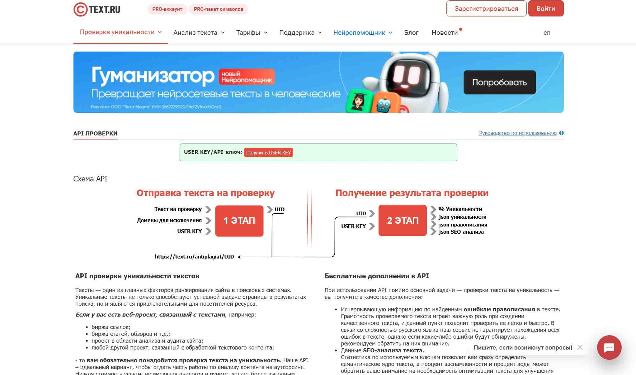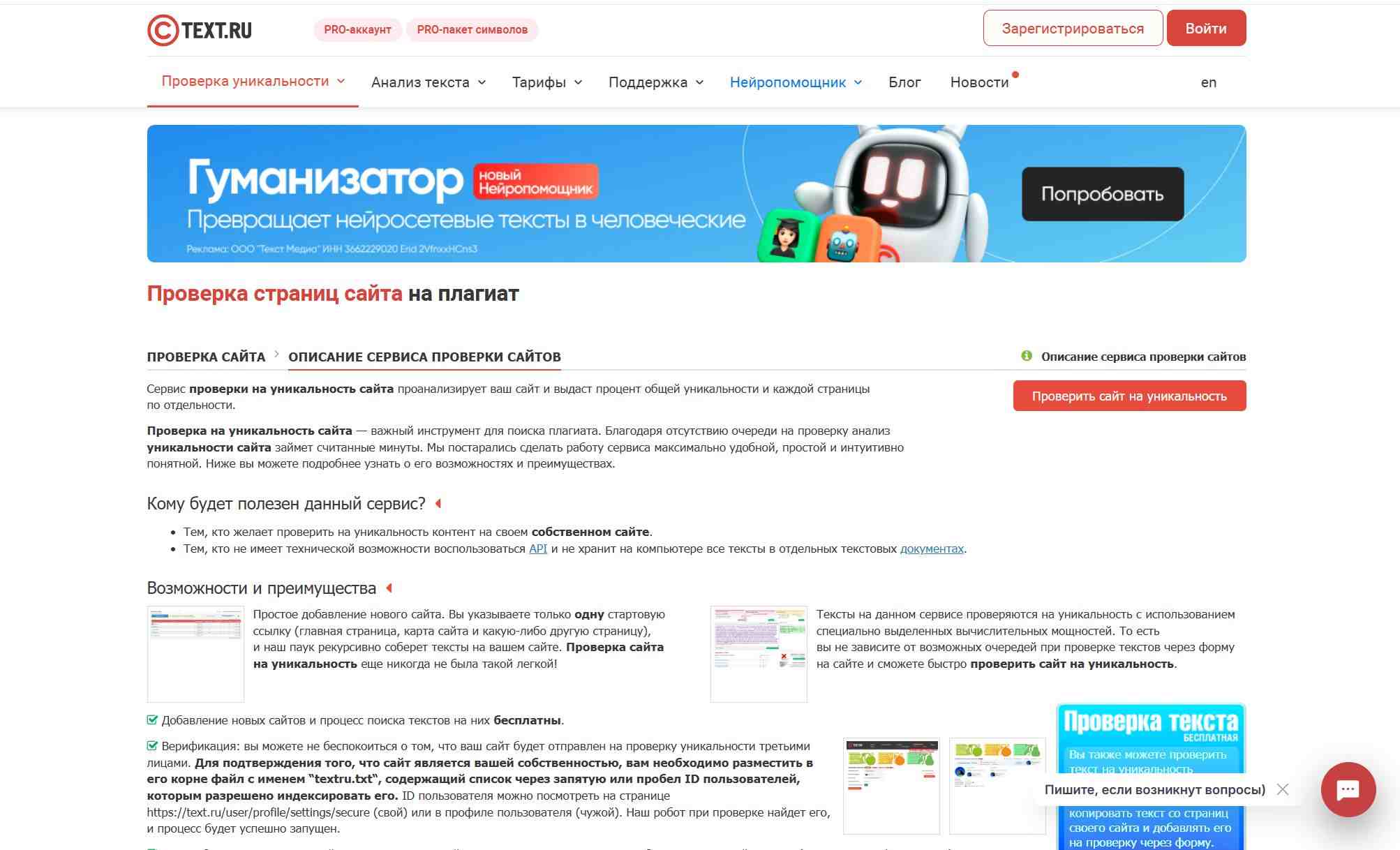 text.ru- сервис предоставляет инструменты для проверки уникальности текста, орфографии, SEO-анализа и использования нейросетей для работы с контентом. Пользователи могут проверять тексты на уникальность, заспамленность и наличие «воды», а также использовать нейроинструменты для генерации текстов и изображений, работы с аудио- и видеофайлами.