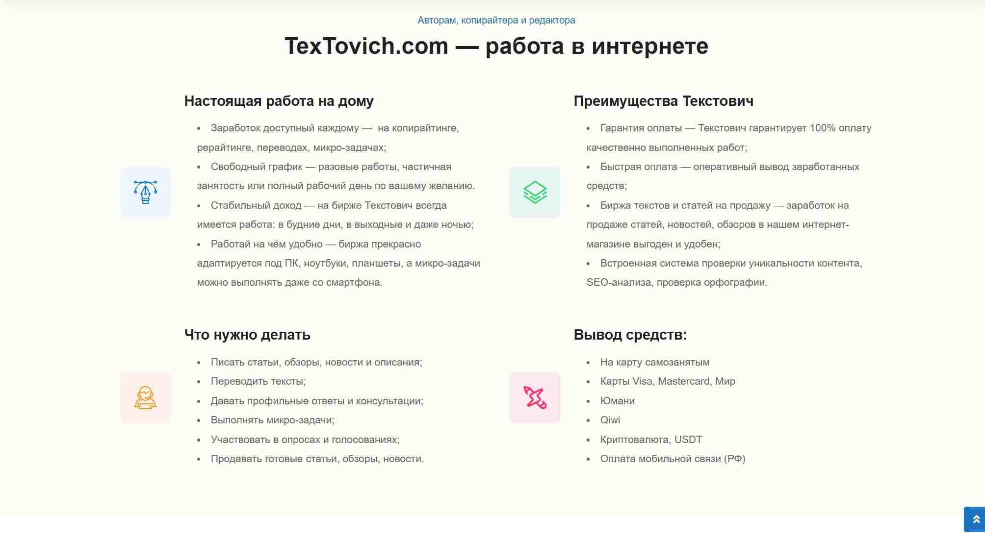 Недавно решила попробовать для подработки новую биржу под названием Текстович. До этого о ней ни разу не слышала — оказалось, она действительно совсем свежая. Зарегистрировалась быстро: логин, пароль, номер телефона — всё стандартно. Сначала на площадке было около двух десятков заданий и всего несколько заказчиков. Подумала, что, возможно, биржа только набирает обороты, и решила протестировать.