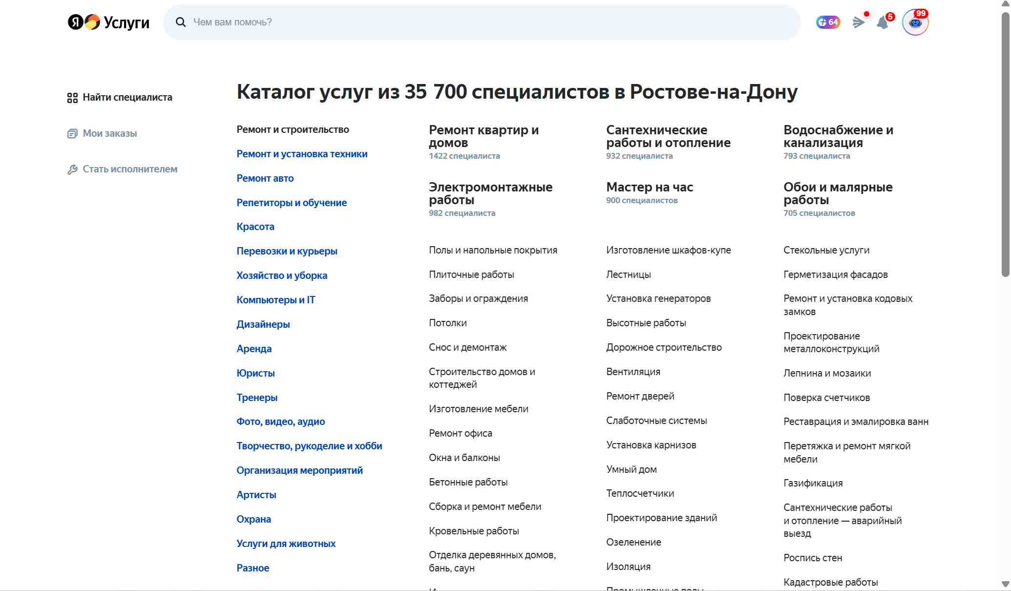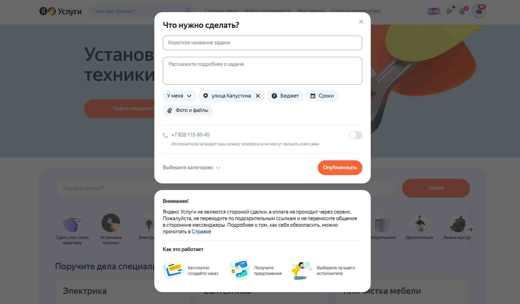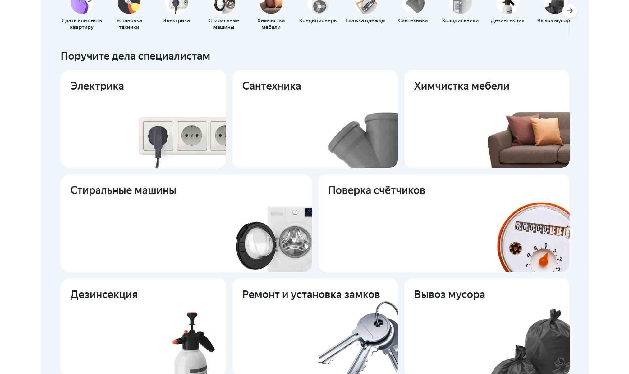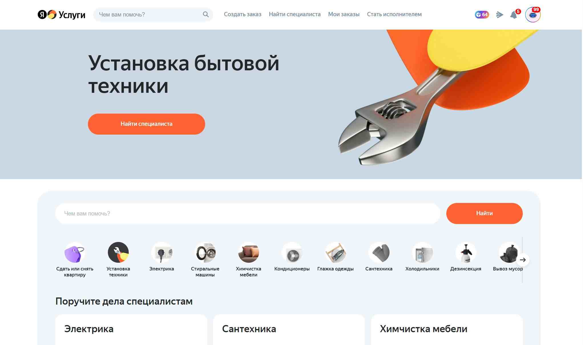 Яндекс Услуги- это сервис выполнения различных задач, здесь можно найти специалистов для выполнения различных задач, таких как установка бытовой техники, электрика, сантехника, химчистка мебели и многое другое. Пользователи могут создать заказ, выбрать исполнителя по рейтингу и отзывам других клиентов, а также договориться о цене самостоятельно.