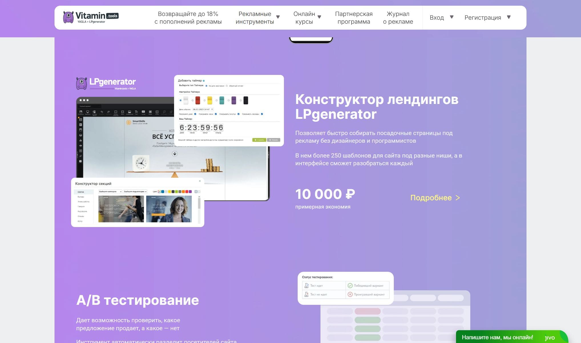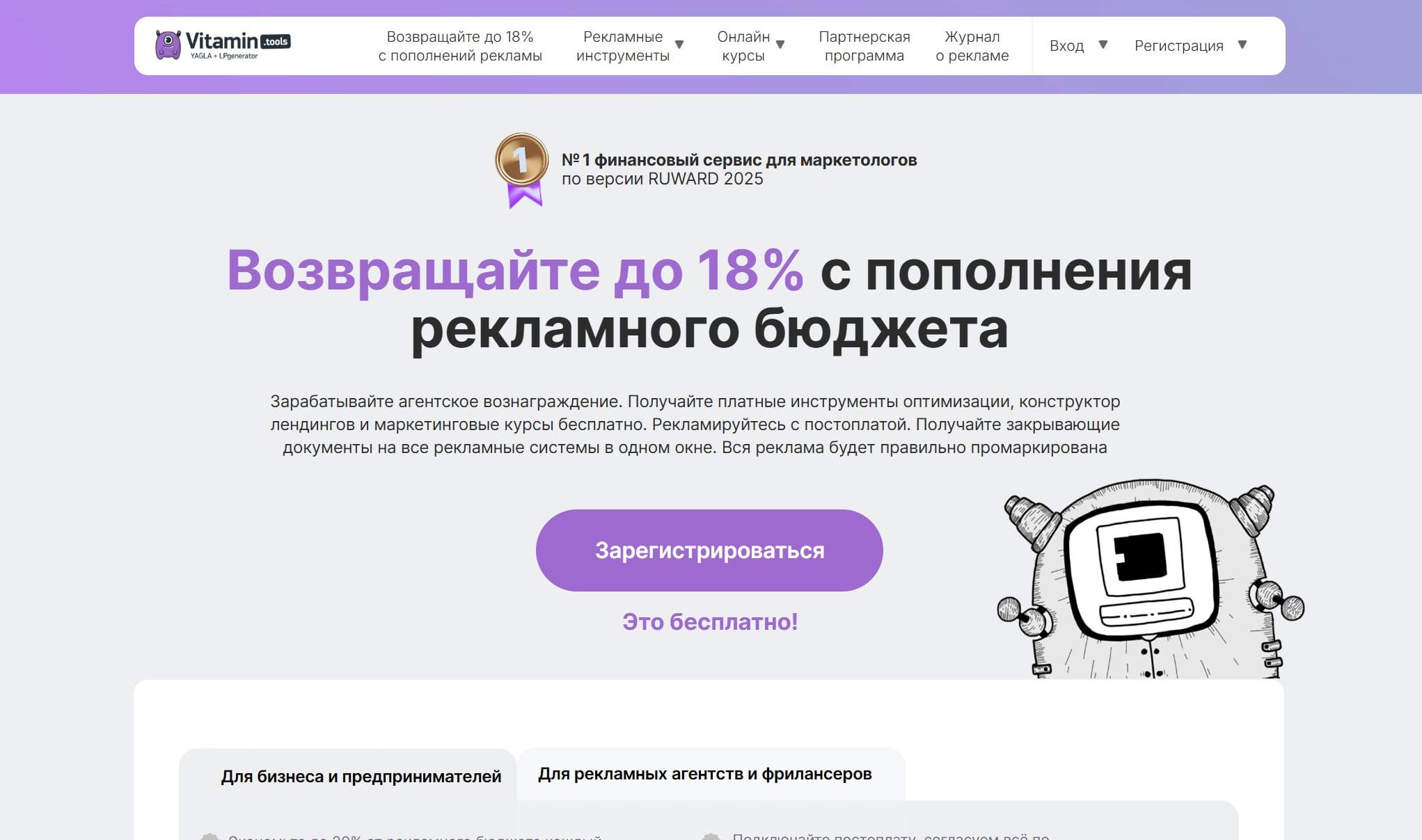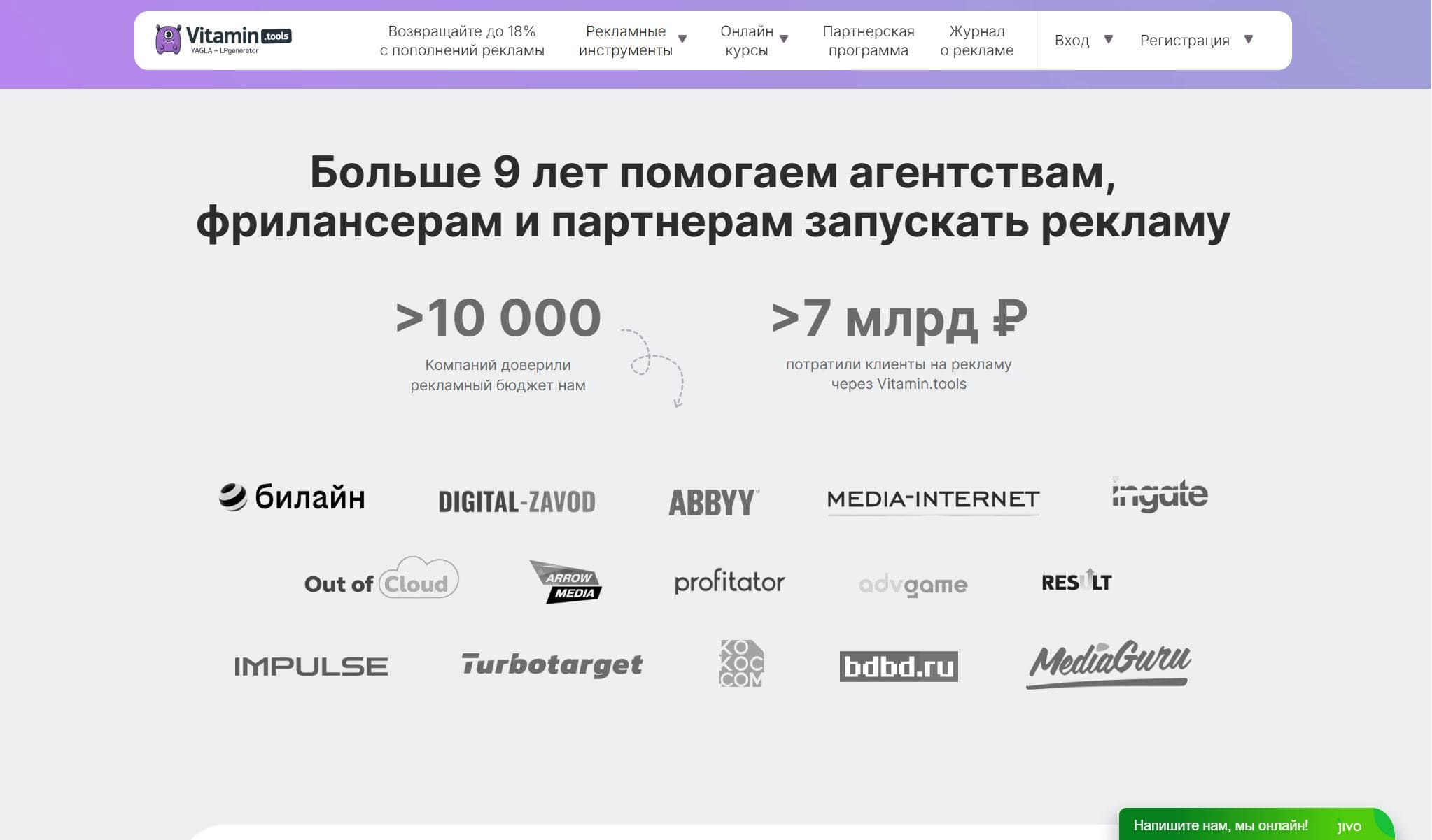 Российская рекламная экосистема, созданная для маркетологов, предпринимателей, агентств. Различные инструменты для рекламы, включая гиперсегментацию, A/B тестирование и конструктор лендингов. Также предлагают обучающие курсы по маркетингу и возможность получения бонусов от партнёров