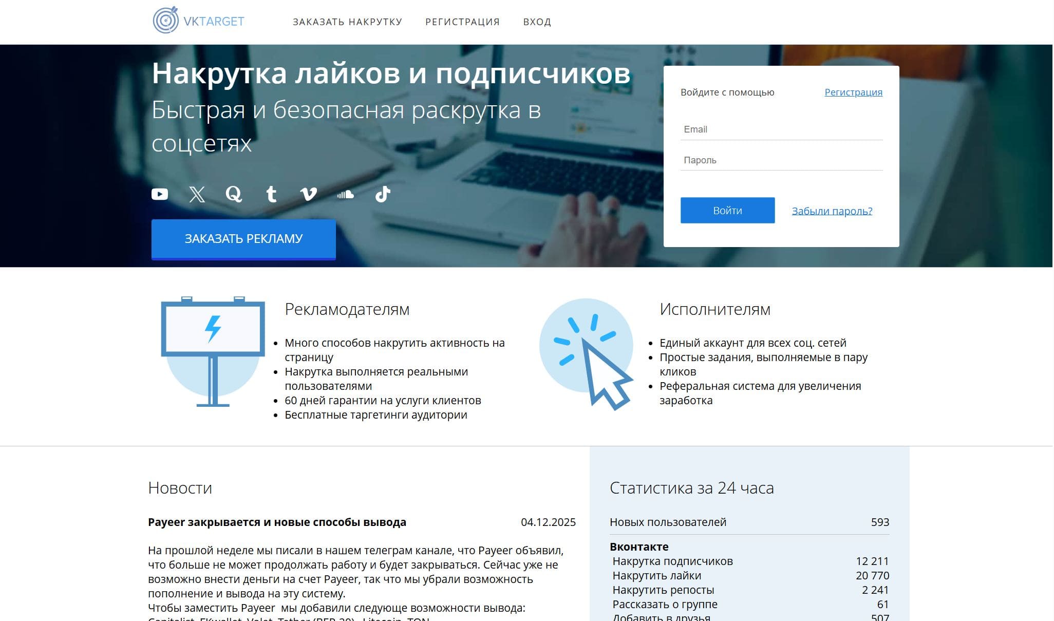 VkTarget предоставляет услуги по накрутке активности в социальных сетях, такие как лайки, подписчики, репосты и другие. Выполнение заказов реальными пользователями и предоставляется гарантия на услуги. Также есть информация о партнёрской программе, изменениях в условиях работы и новостях сервиса.