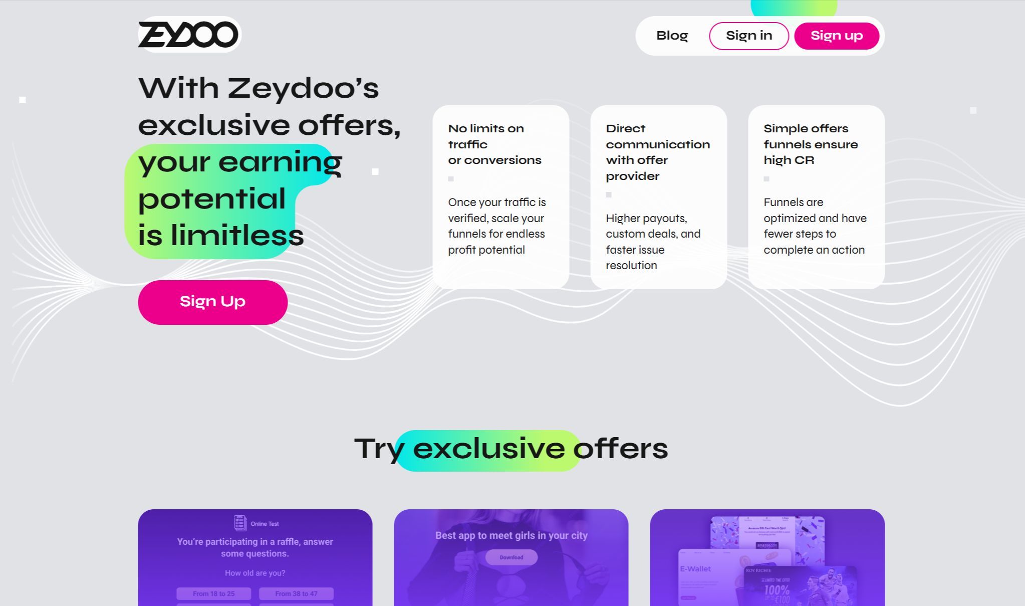 Платформа предлагает широкий спектр CPA-продуктов для монетизации трафика, включая опросы, мобильные приложения и розыгрыши призов. Партнёры могут выбирать из множества предложений в разных вертикалях и зарабатывать на каждом действии пользователя.